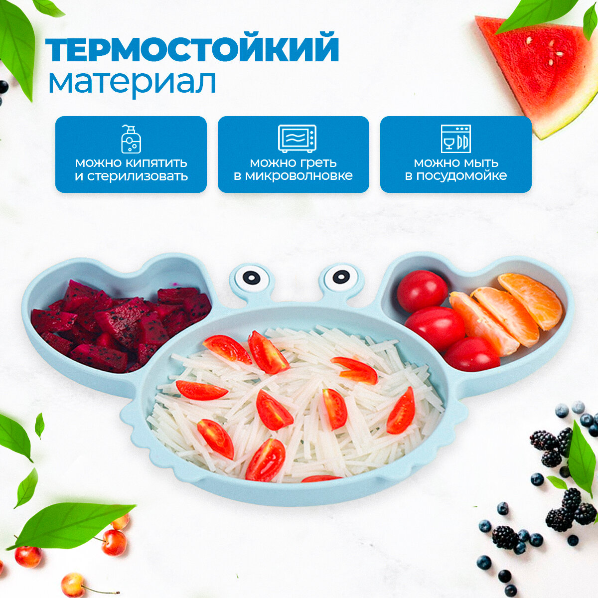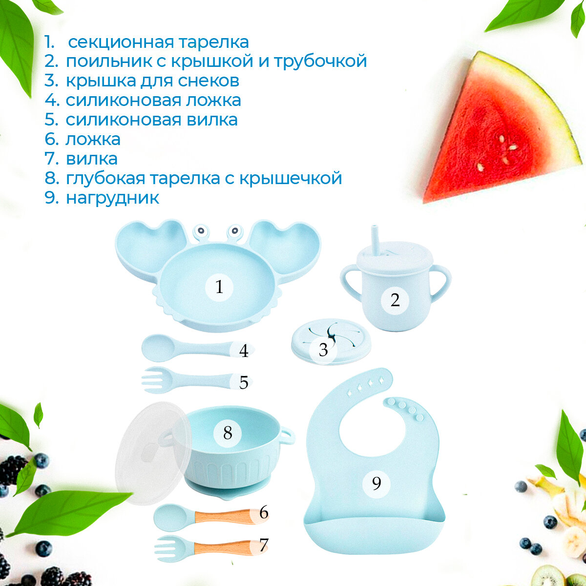Купить Набор детской посуды силиконовый для кормления малыша на присосках, 9 предметов, крабик голубой, для мальчика