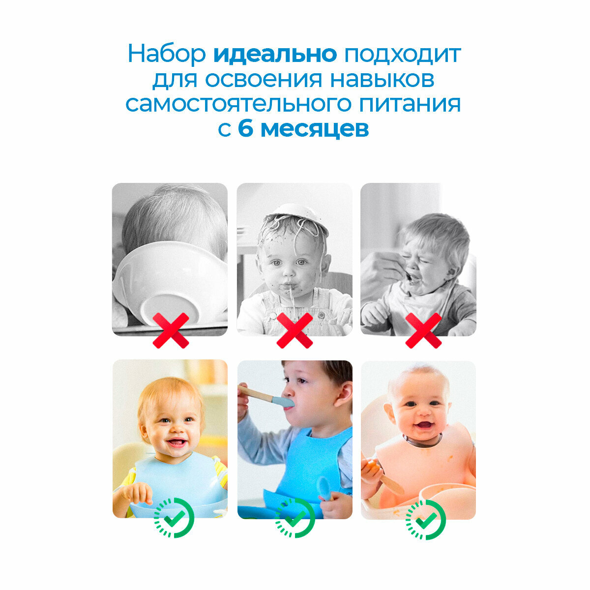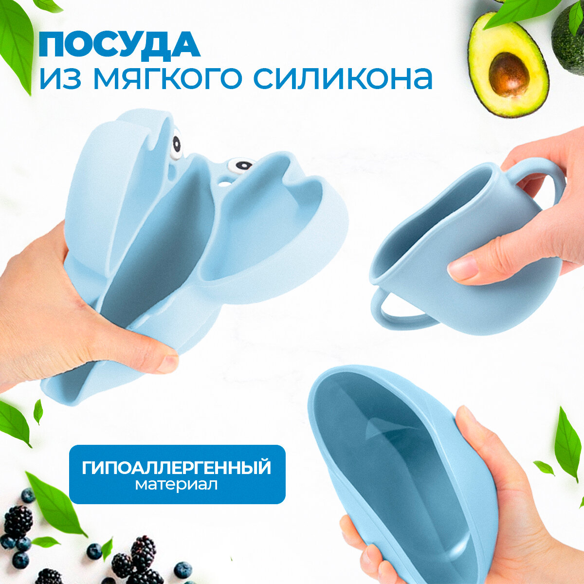 Набор детской посуды силиконовый для кормления малыша на присосках, 9 предметов, голубой, для мальчика