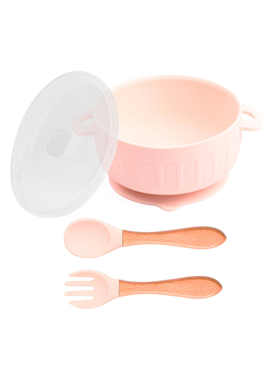 Набор максимальный (9 предметов) силиконовой детской посуды для кормления малыша Plates светло-розовый