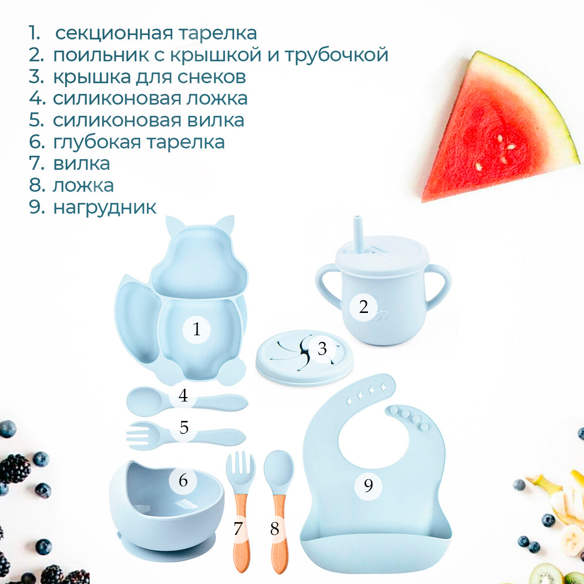 Купить Набор детской посуды силиконовый для кормления малыша на присосках, 9 предметов, белочка голубая, для мальчика