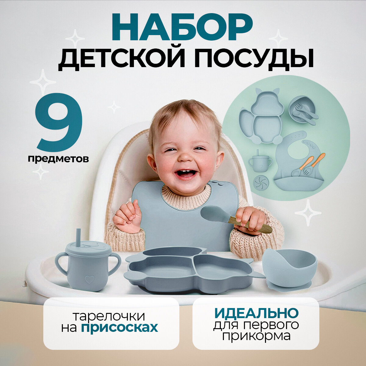 Набор детской посуды силиконовый для кормления малыша на присосках, 9 предметов, голубой, для мальчика