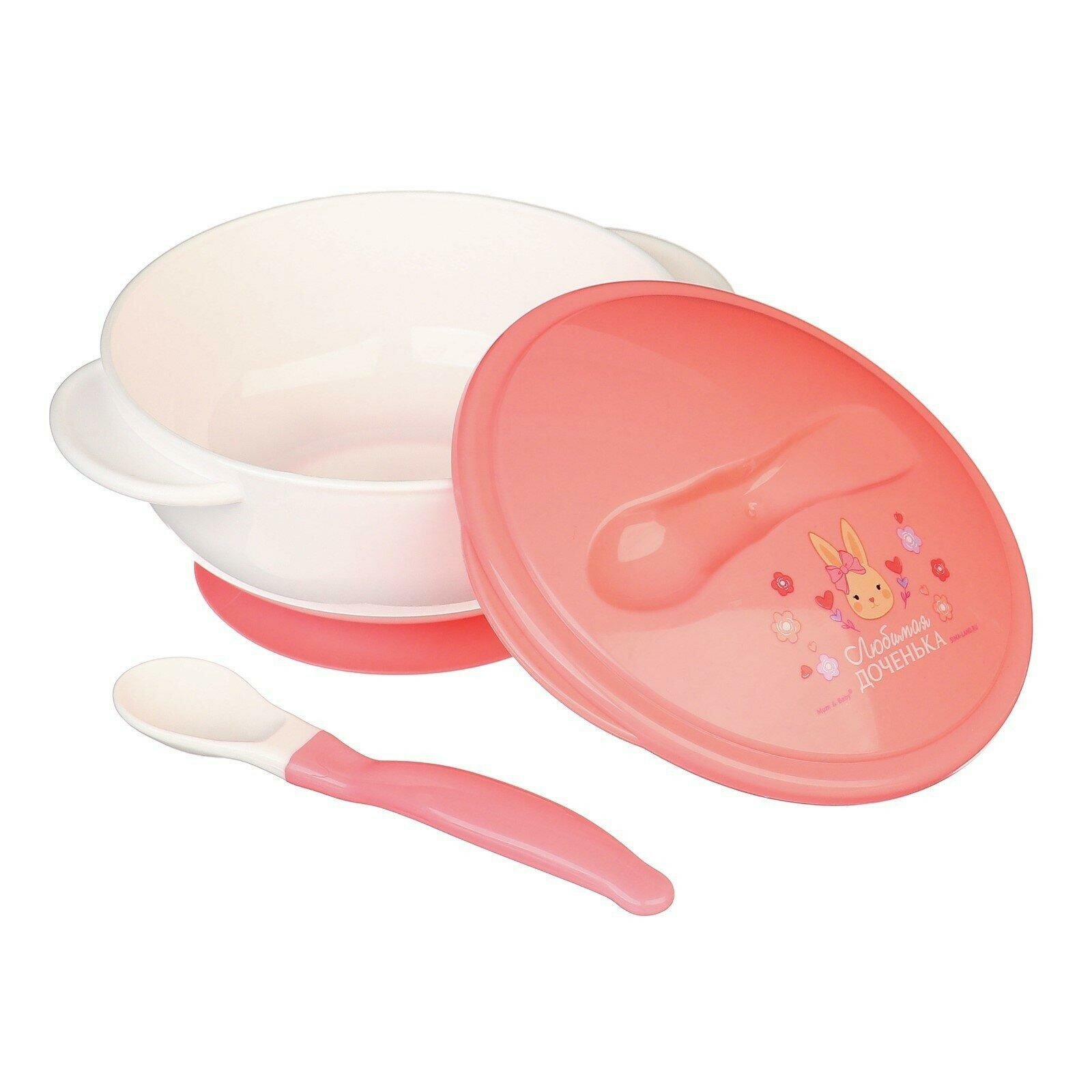 Купить Набор детской посуды, «Доченька», 3 предмета: тарелка на присоске, крышка, ложка, цвет розовый