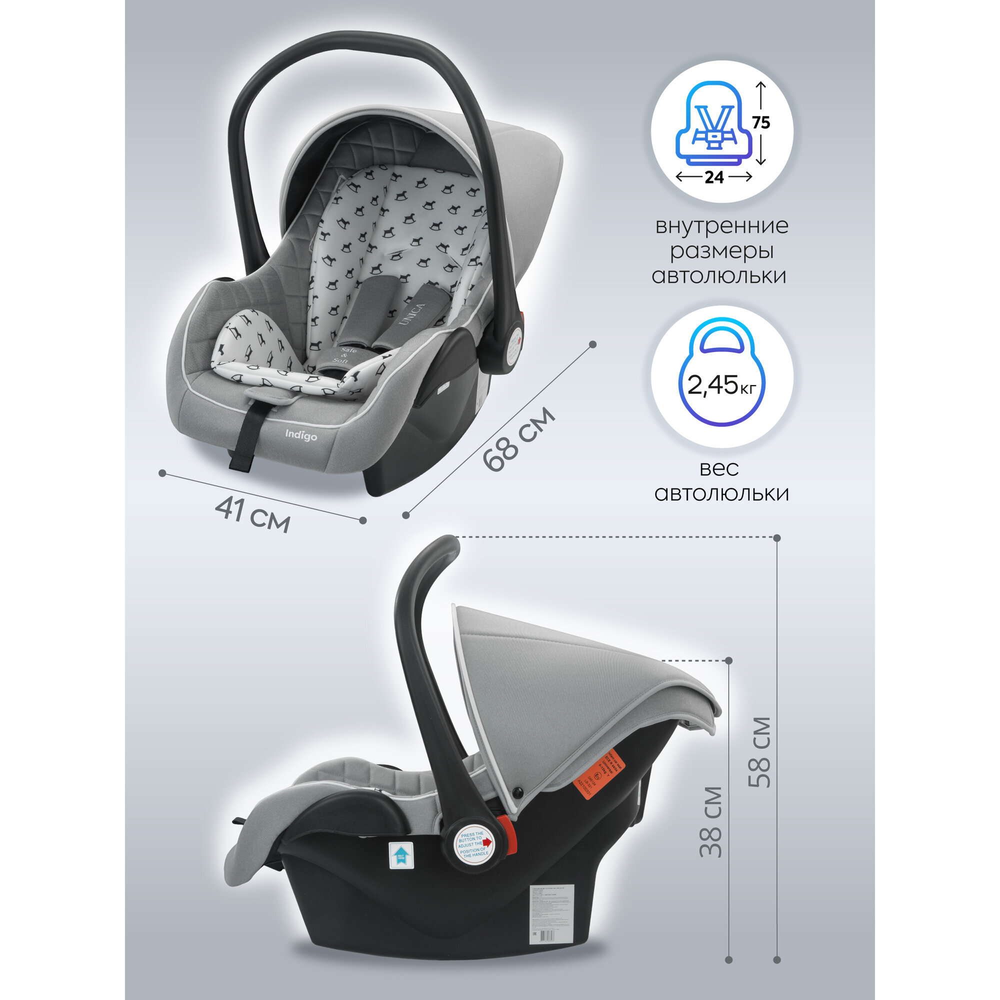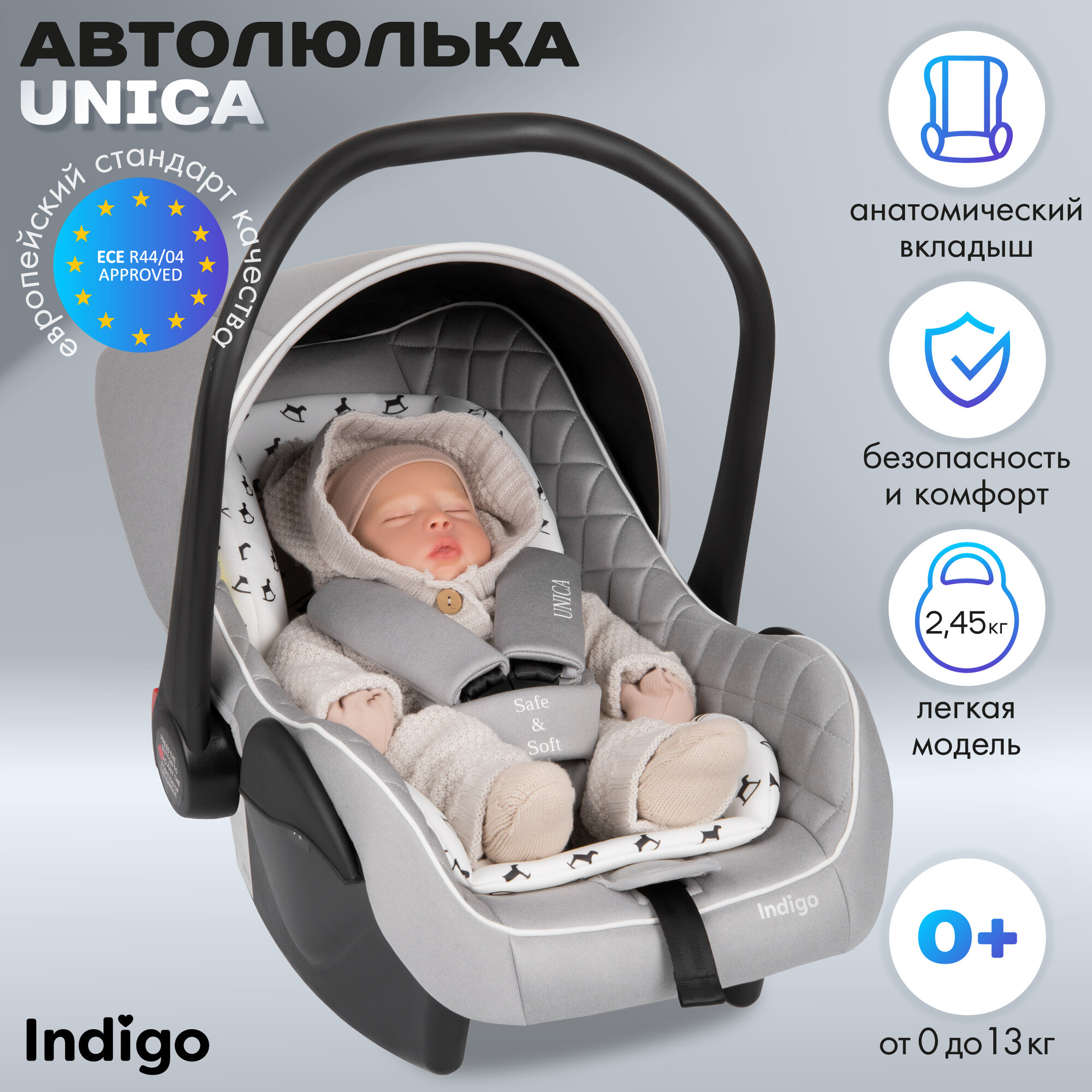 Купить Автокресло Indigo UNICA, группа 0+, 0-13 кг, св. серый