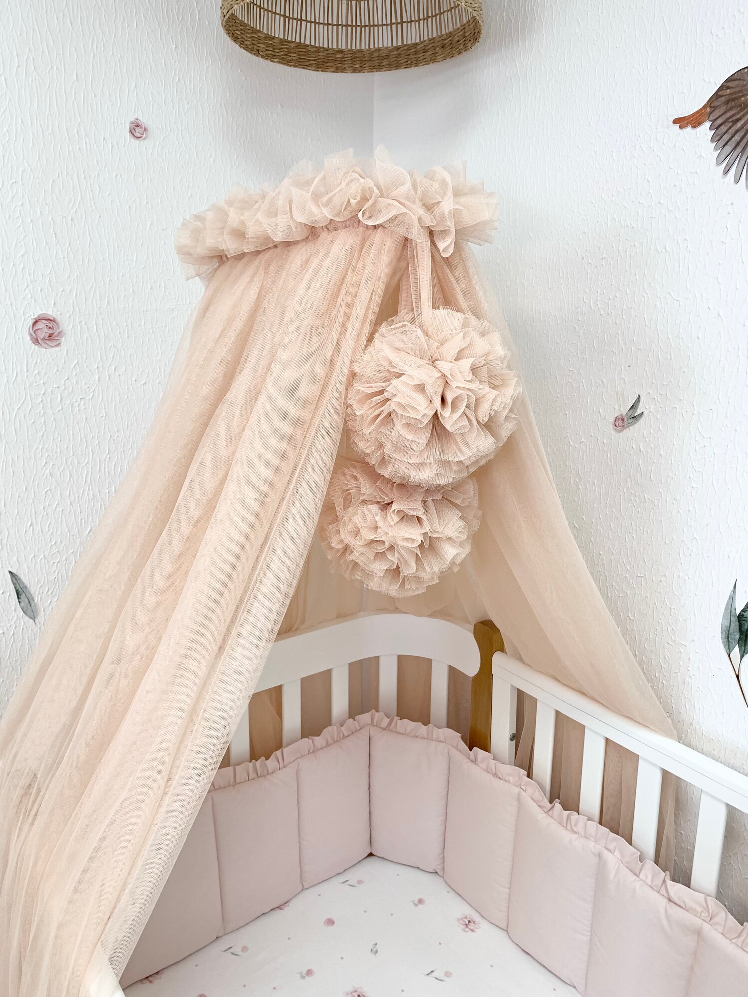Балдахин на детскую кроватку с помпонами, фатин, нежная пудра