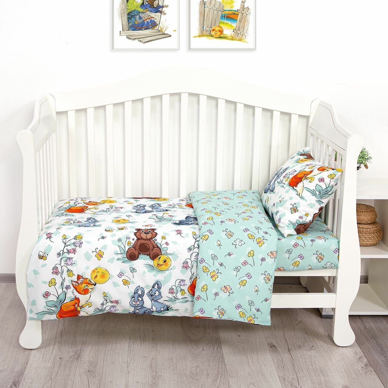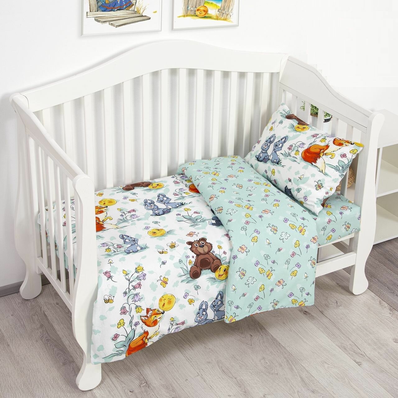 Детский комплект постельного белья из бязи АртПостель "Улетные мишки" Ясельный, в детскую кроватку, зеленый, зверюшки