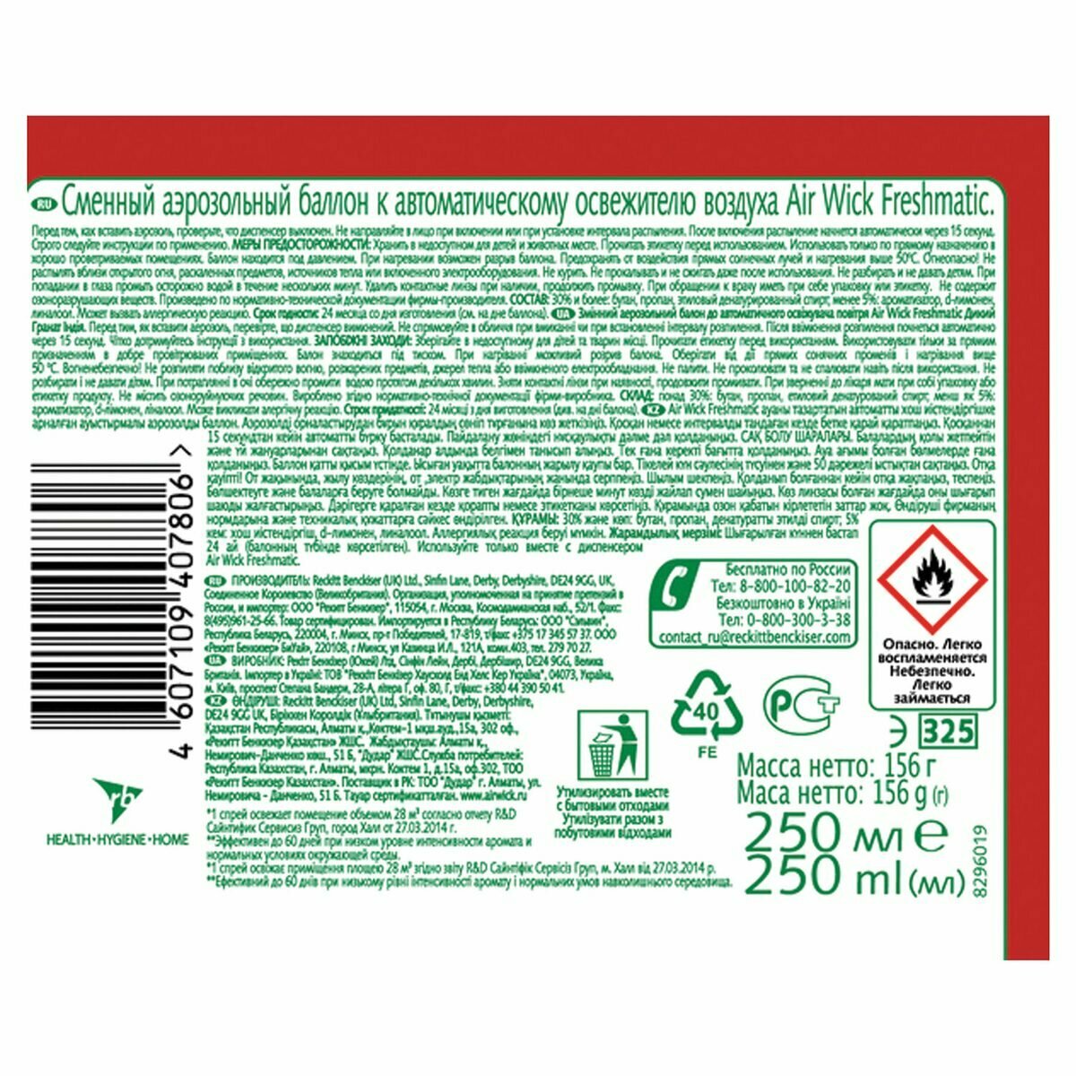 | Дополнительная информация | баллон для автоматического освежителя воздуха Air Wick Freshmatic; перед тем, как вставить аэрозоль, проверьте, что диспенсер выключен; не направляйте в лицо при включении или при установке интервала распыления; после включения распыление начнется автоматически через 15 сек |