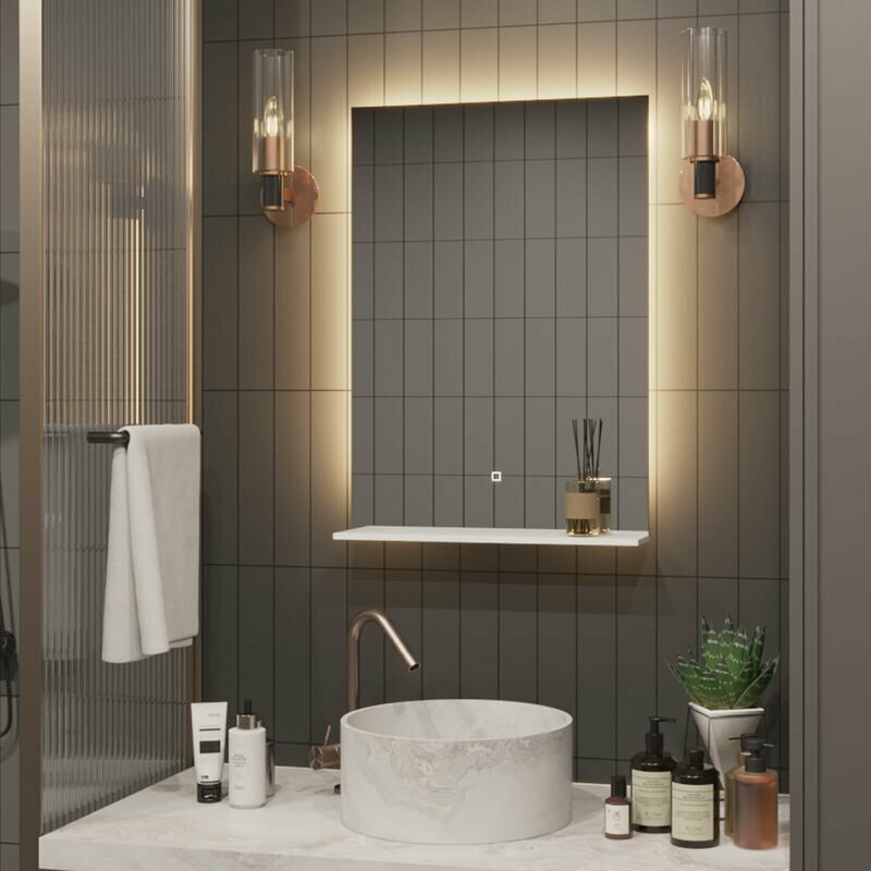 Зеркало в ванную с подсветкой настенное Alias Квартал 80*70 для ванной с тёплой LED-подсветкой и белой полкой, сенсорная кнопка