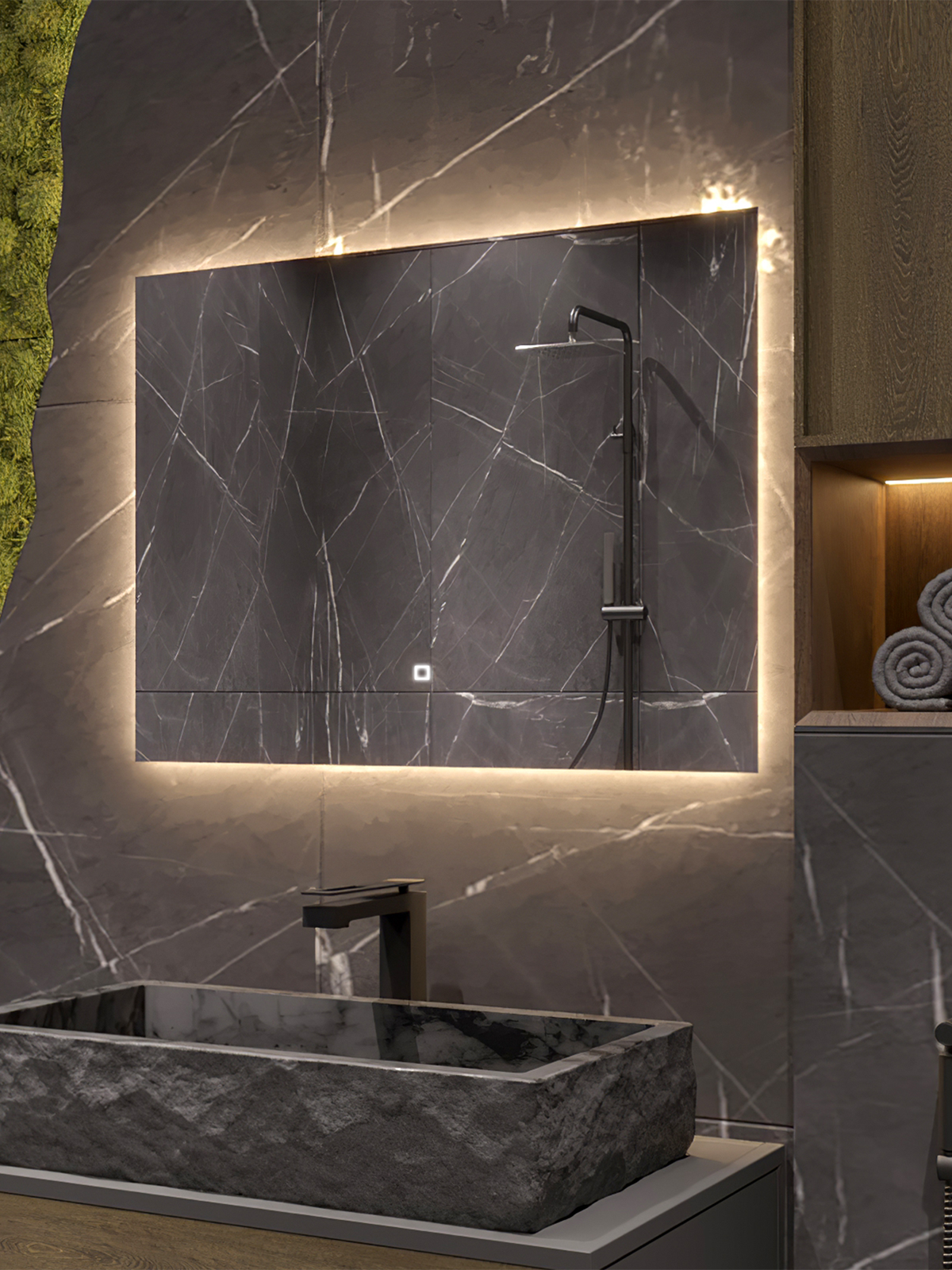 | Дополнительная информация | фоновая LED-подсветка 6000K - холодная, сенсорный выключатель с белой индикацией кнопки и диммером (регулировка яркости длительным нажатием на кнопку) расположен снизу по центру, зеркальное полотно бельгийского бренда AGC толщиной 4 мм, толщина подложки 16 мм, кромка зеркала шлифованная. Общая толщина зеркала 21 мм. светодиодная лента в один ряд мощностью 9,6 Вт/м, 120 шт/м, питание от сети 220В - 2 провода, стандартное подключение – скрытый монтаж к проводу, выведенному из стены, возможно подключение к розетке (вилка в комплект не входит), зеркало вешается на два самореза с дюбелями (входят в комплект) на проушины, расположенные на тыльной стороне зеркала. |