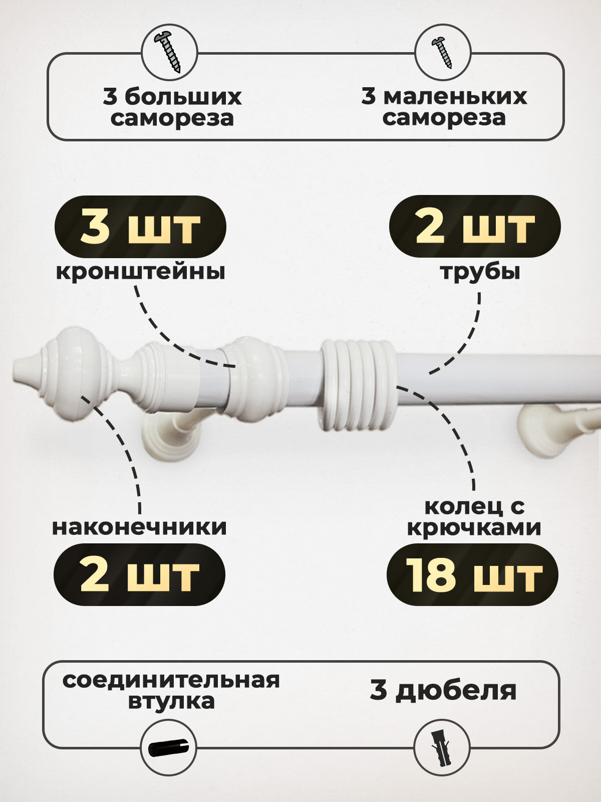 | Комплектация | Комплектация для карниза 200 см.: 2 штанги, соединитель для трубы, 3 кронштейна в сборе, 2 наконечника, 18 колец и 18 крючков для штор, 3 дюбеля, 3 самореза, схема сборки. |