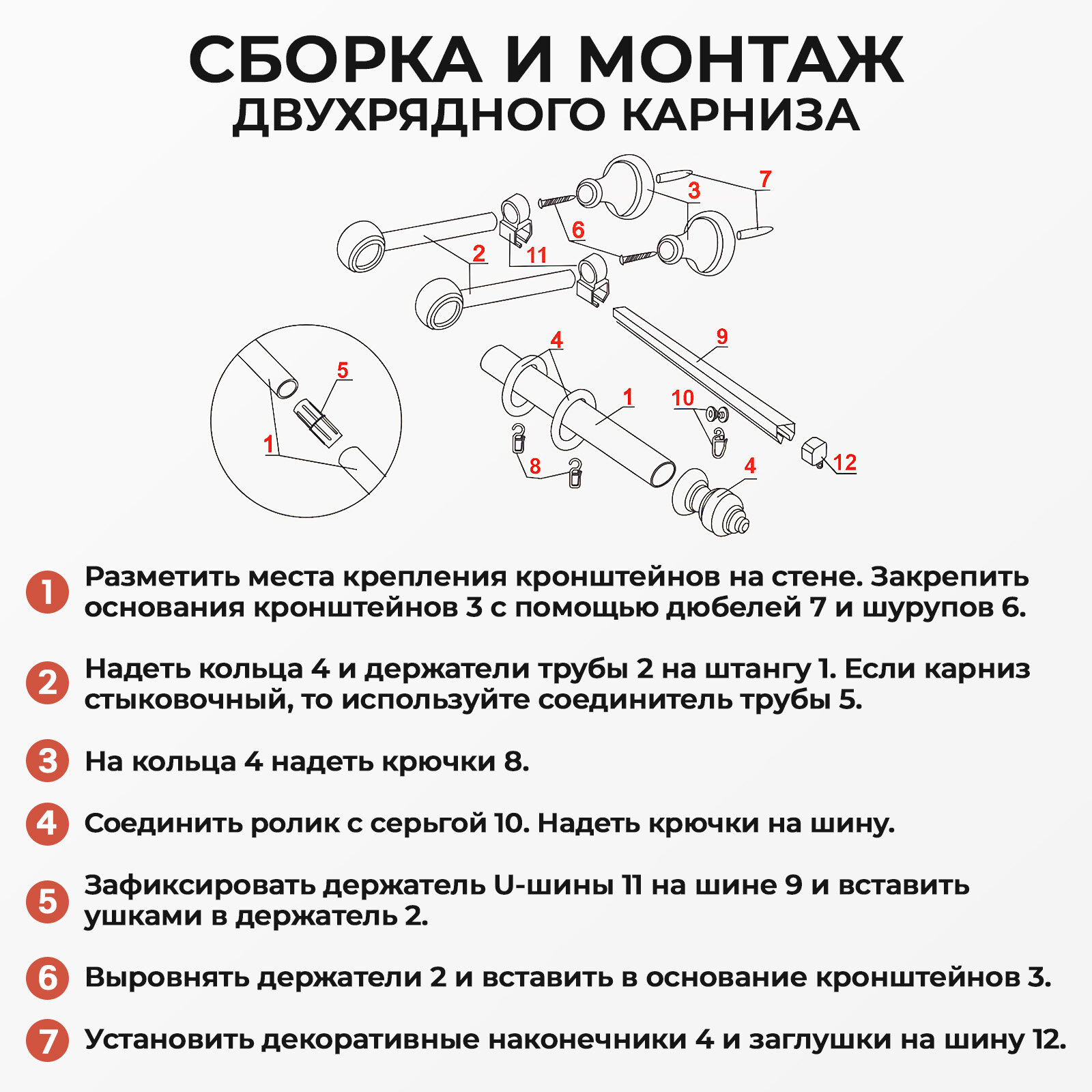 | Комплектация | Комплектация для карниза 200 см.: 2 штанги, соединитель для трубы, 3 кронштейна в сборе, 2 наконечника, 2 шины для тюля, 2 маленьких и 1 большой держатель для шины, 2 заглушки для шины, 18 крючков для тюля, 18 колец с крючками для штор, 3 дюбеля, 3 самореза, схема сборки. |