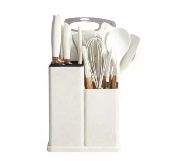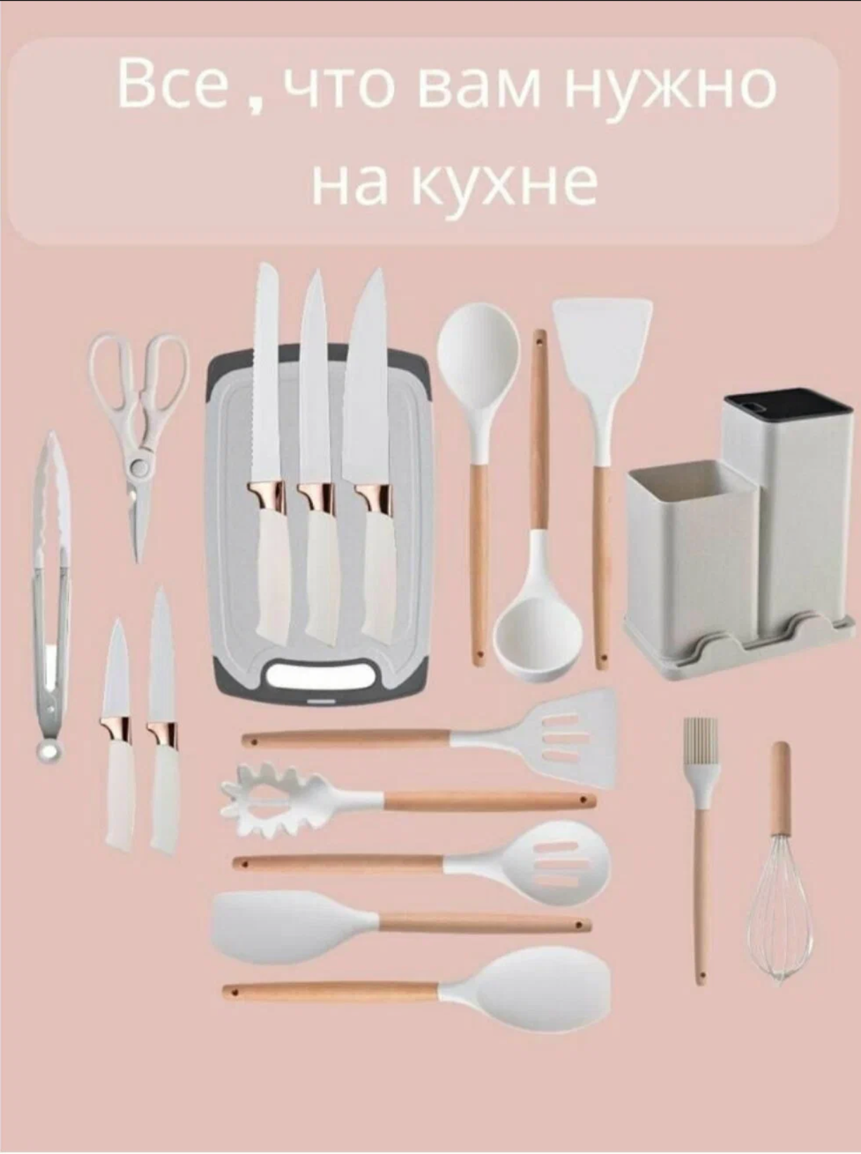 | Комплектация | Щипцы кухонные, лопатка кондитерская и лопаточка с отверстиями для жарки на сковороде, ложка для спагетти, ложка для салата, ложка для выпечки, шпатель, половник, шумовка, венчик для взбивания, кисточка для масла, 5 ножей разного размера, разделочная доска и подставка для хранения приборов. |