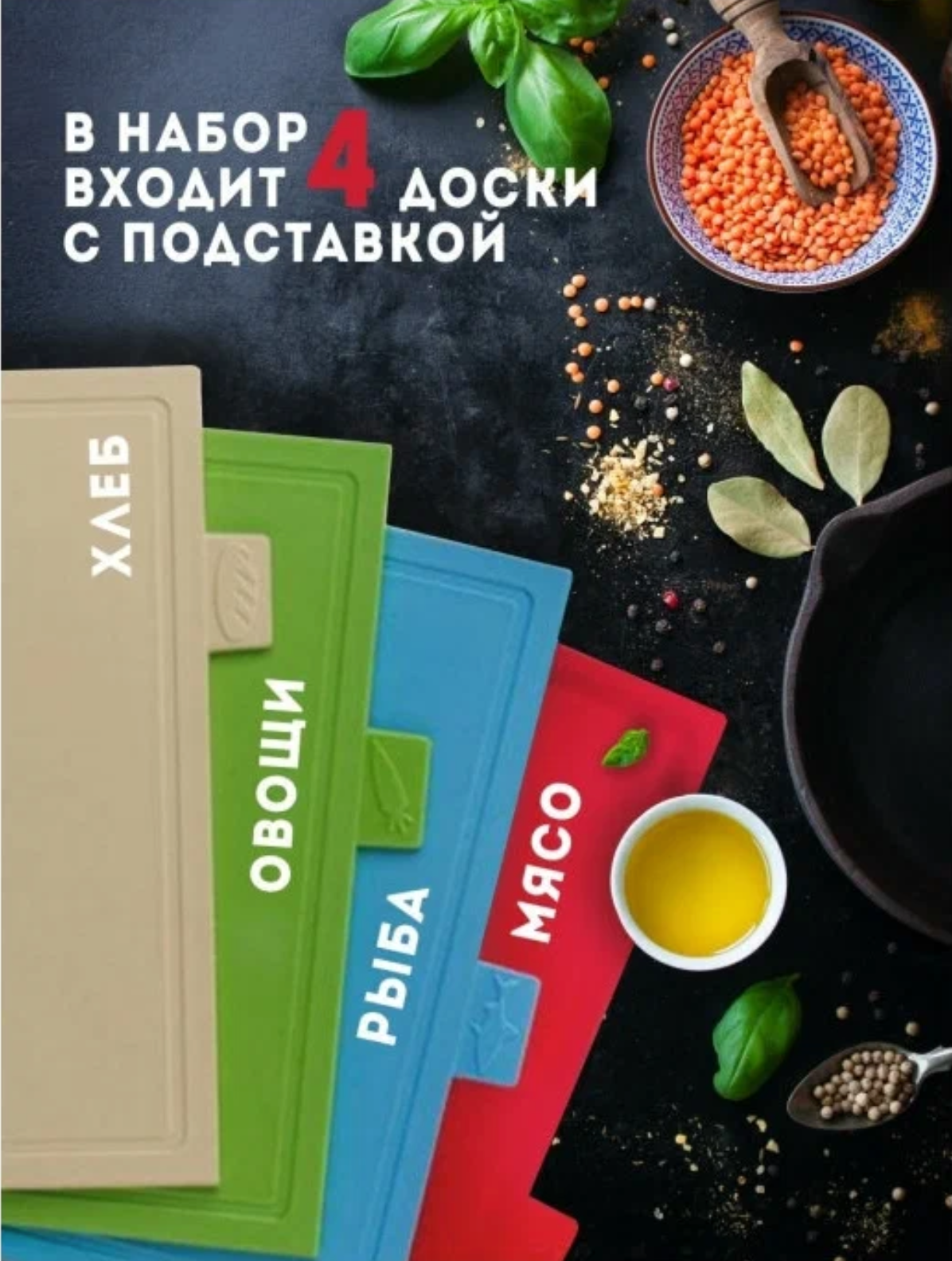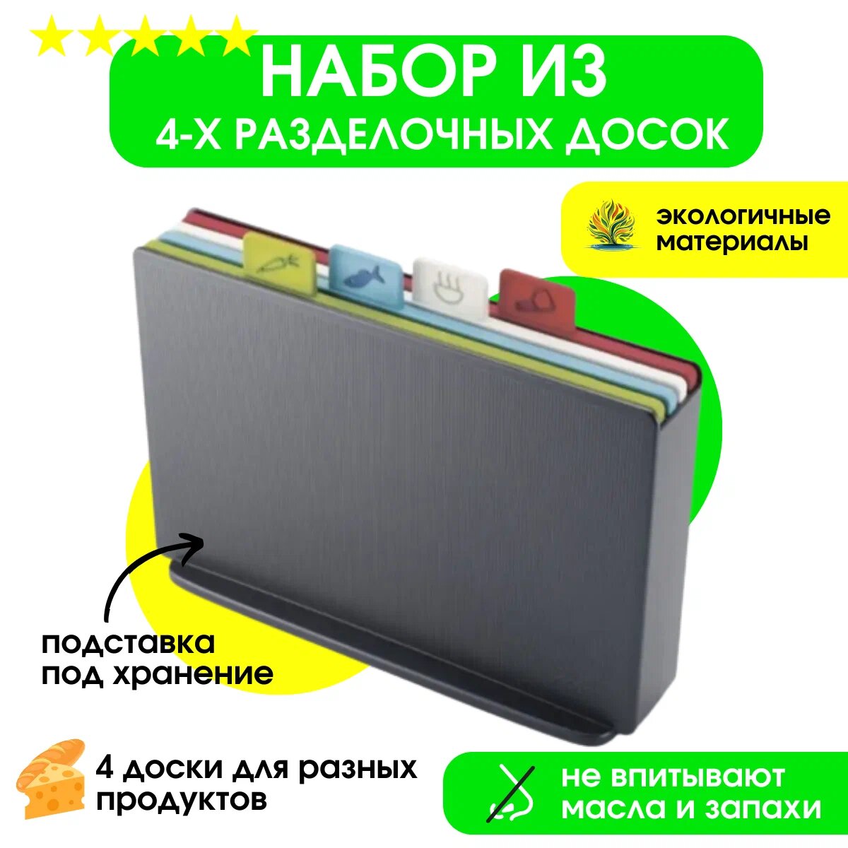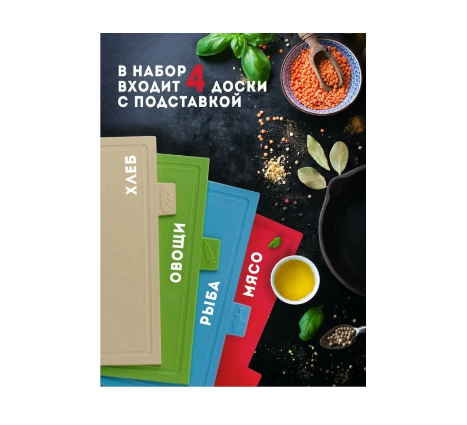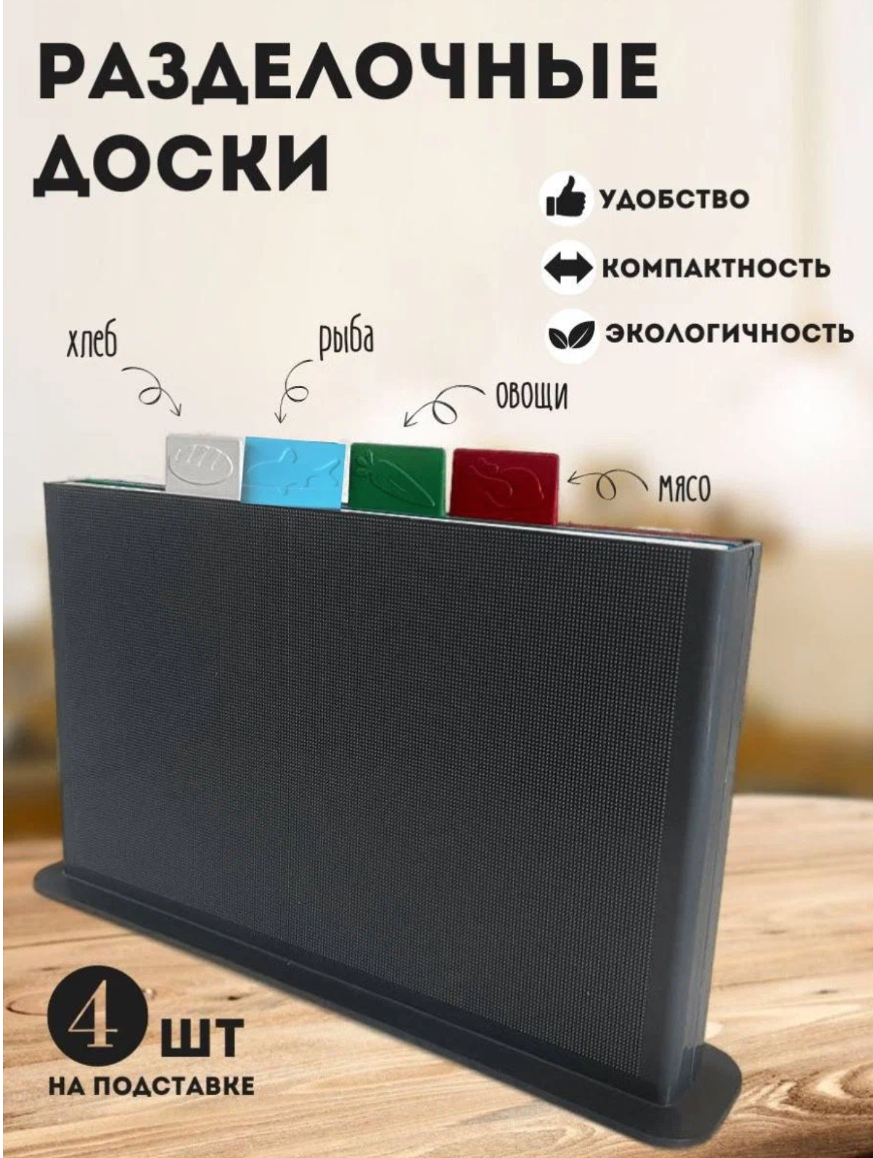 | Подробная комплектация | подставка, 4 разделочные доски: для мяса, для рыбы, для овощей и фруктов, для хлебобулочных изделий |