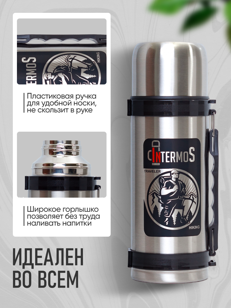 Термос "Intermos" 1,2 л., с широким голом, чашкой, ремнем для переноски, нержавеющая сталь, цвет хром