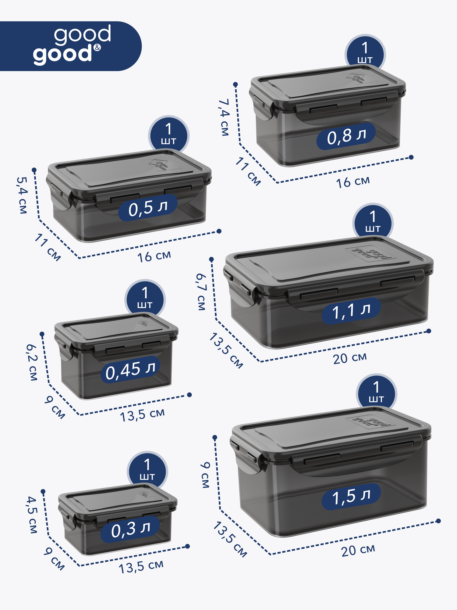 Контейнер для еды герметичный 6 шт good&good набор контейнеров для еды 0,33 л; 0,45 л; 0,5 л; 0,8 л; 1,1 л; 1,5 л