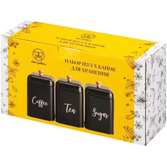 Купить Набор Elan Gallery 3 банок для сыпучих продуктов "Tea, coffee, sugar" с крышками, черный, 11,2*11,2*19 см 1,5 л