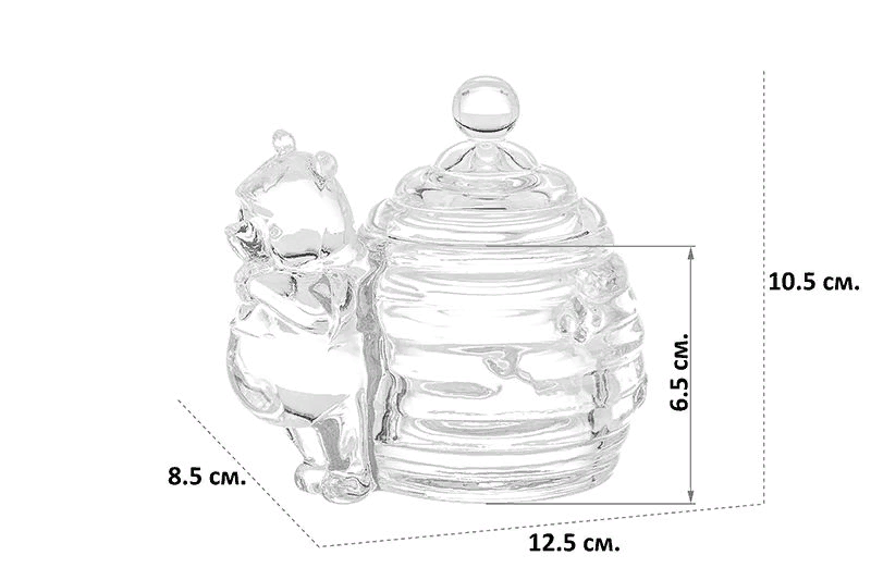 | Дополнительная информация | Горшочек д/меда "Медвежонок" 12,5*8,5*10,5 см 150 мл, стекло, высота без крышки - 6,5 см |