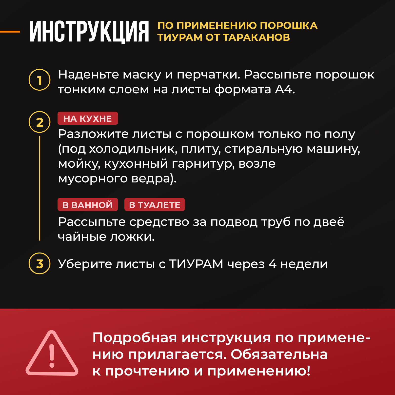 | Способ применения | обязательно перед обработкой нужно надеть резиновые перчатки, защитную маску и защитные очки (подойдут любые). Затем берем листок А4 или газету или коробочку с невысокими бортиками, также подойдут одноразовые тарелки рассыпаем порошок Тиурам тонким слоем 2-3 сайные ложки на одну приманку и раскладываем готовые приманки для тараканов в местах недоступных для детей и домашних животных, т.е под холодильник, под кухонный гарнитур, под раковину, плиту и т.д. В ванной комнате разложить под ванну, стиральную машину. Раскладываем только по полу и только в труднодоступных местах. Покидать помещение нет необходимости, но делать дополнительные проветривания рекомендовано. |