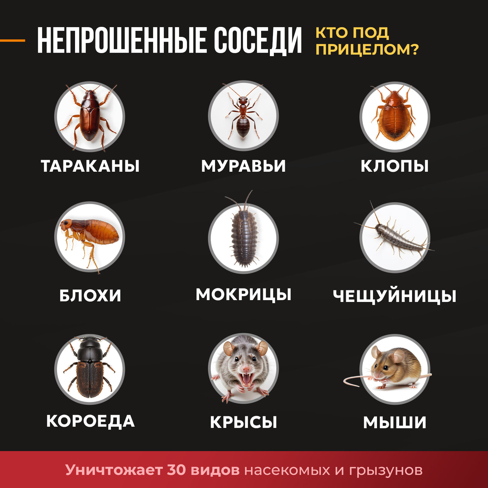 | Вид насекомых | блохи / комары / мокрицы / муравьи / ползающие насекомые / постельные клопы / тараканы / чешуйницы |