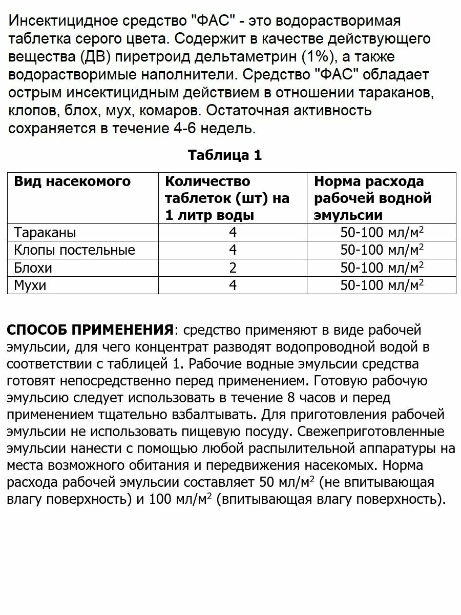 | Способ применения | Растворить 3 таблетки в 1л воды комнатной температуры и тщательно перемешать. Затем с помощью распылителя обработать свежеприготовленным раствором места скопления, обитания, пути передвижения насекомых. |
