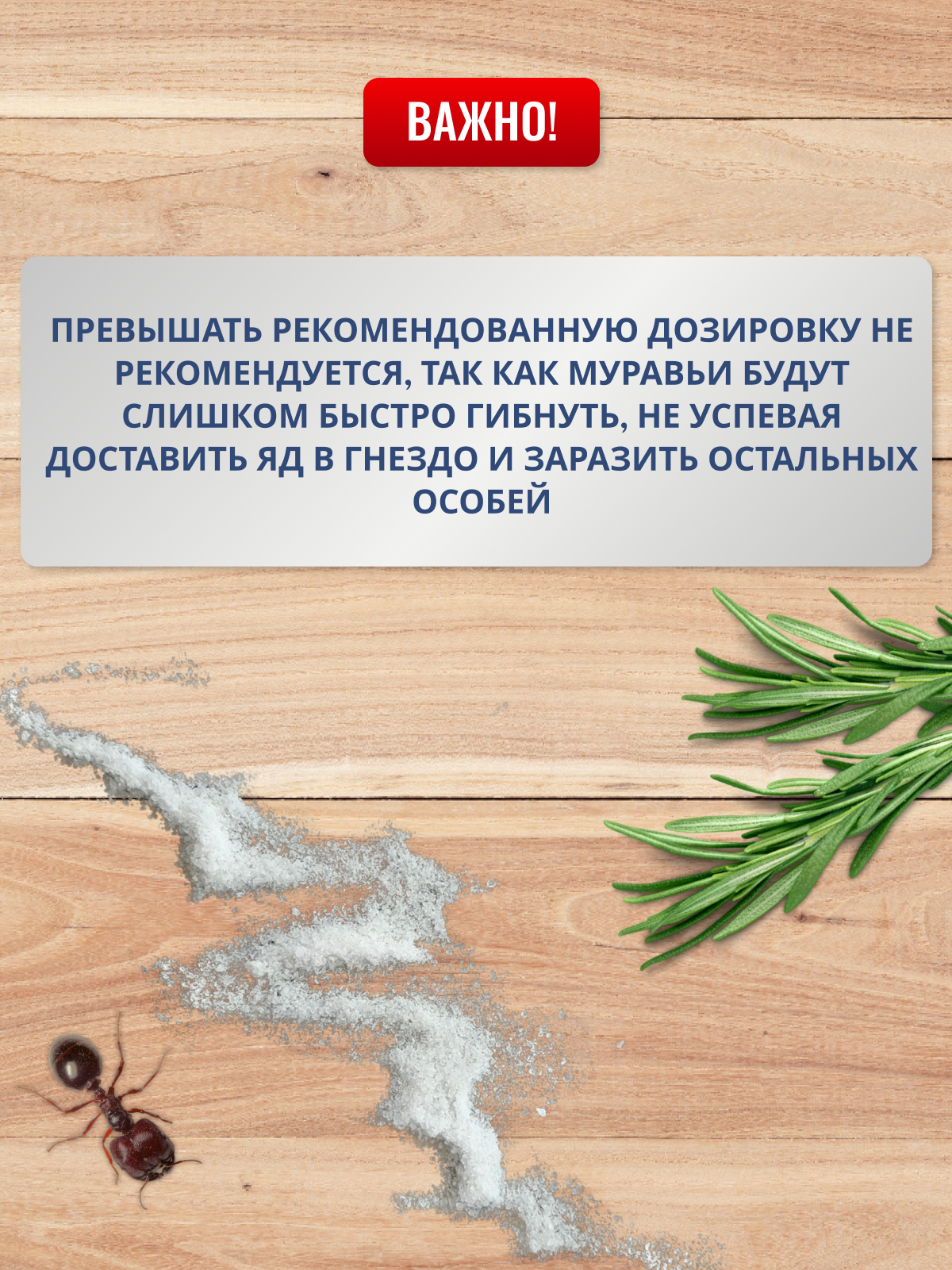 | Способ применения | в виде порошка: порошок рассыпать тонким слоем (ок. 10 г на 1 м²) на гнездо и на пути следования муравьев (т.е на муравьиных дорожках), на трещинах, щелях и швах, откуда он будет перенесен в гнездо, уничтожая колонию; в виде раствора: порошок развести в воде, тщательно помешивая, из расчета 100 г на 2,5 л воды, обработку проводить сразу после приготовления раствора; трещины, щели, швы и гнезда муравьев полить приготовленным раствором; также необходимо обработать все пути подхода к муравьиному гнезду; не обрабатывать места (пол, лестницы и т.п.) частого передвижения людей |
