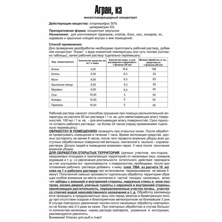 | Способ применения | Для проведения дезобработки необходимо приготовить рабочий раствор, добавляя средство «Агран» в воду комнатной температуры. Рабочий раствор наносят способом орошения при помощи распылительной аппаратуры 50мл раствора на 1 м2 для невпитывающих влагу поверхностей, 100 мл раствора на 1 м2 . Обрабатывают места посадки комаров в помещениях, а также наружные стены строений и т.п. Для уничтожения личинок комаров равномерно орошают поверхность закрытых городских водоемов. Средство обладает острой инсектоакарицидной активностью в течение 24-48 часов и остаточным действием в течение 3-5 недель. При обработке открытых территорий обычно достаточно 1-2 обработок за сезон. |