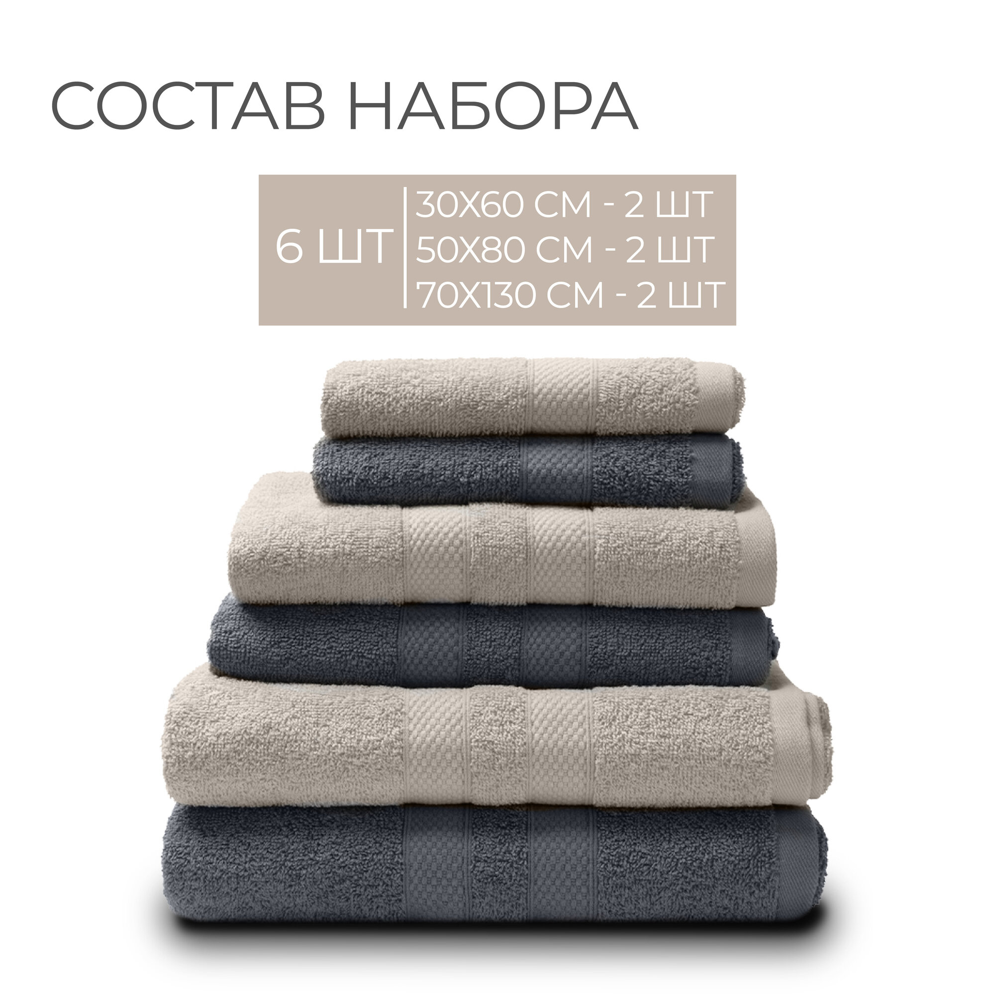 Полотенца махровые Unifico Natur джинс, набор из 6 шт.: 30х60 2 штуки, 50х80 2 шт., 70х130 2 шт.