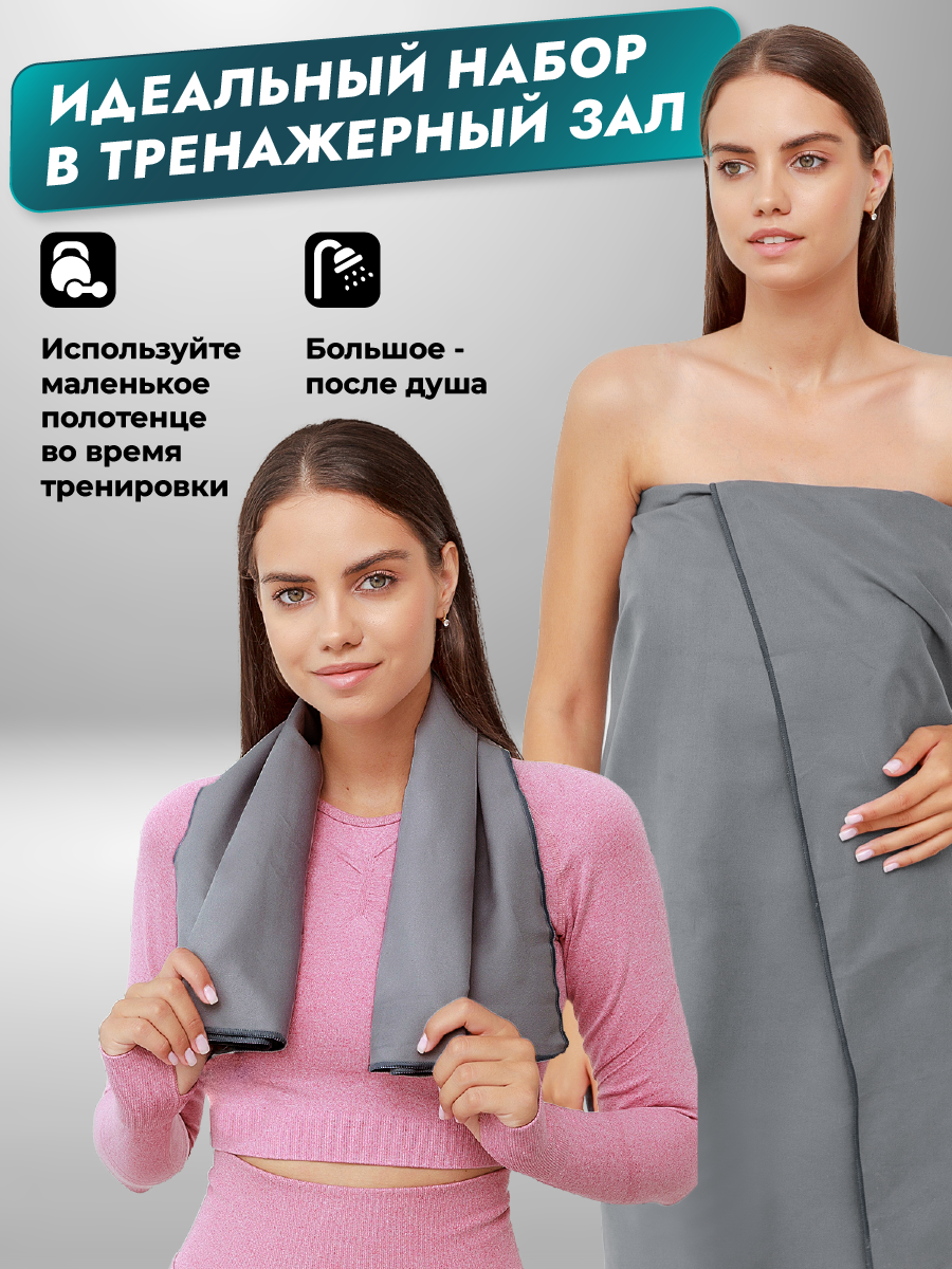 Набор спортивных полотенец OCEAS из микрофибры ,быстросохнущее для фитнеса и йоги, 150х75 см, 40х80 см, серый