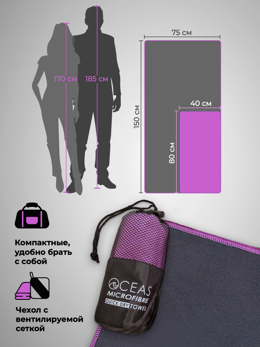 Набор спортивных полотенец OCEAS из микрофибры ,быстросохнущее для фитнеса и йоги, 150х75 см, 40х80 см, фиолетовый