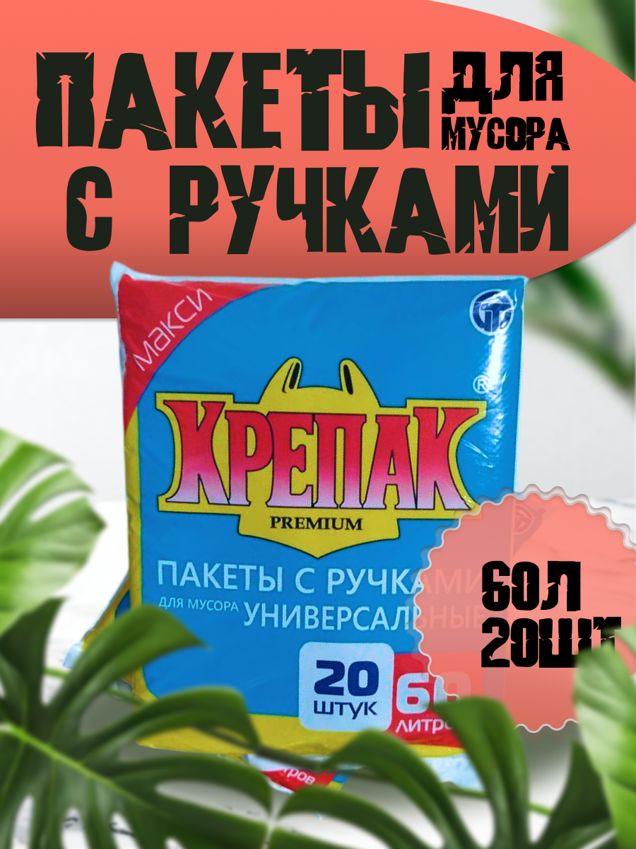 Мешки для мусора `Крепак` стопа с ручками 60 литров 20 шт ПНД 13мкм