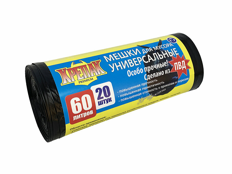 Купить Мешки для мусора Крепак, особо прочные, сверхпрочные, черные, ПВД, 60л, 20шт