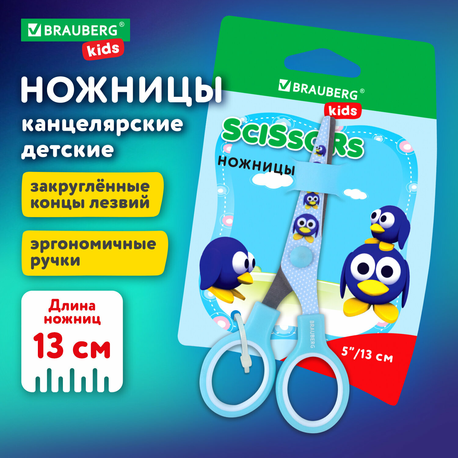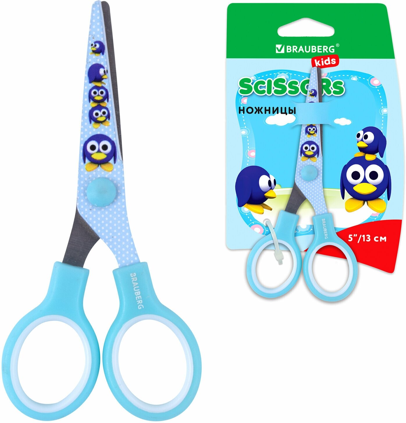 Ножницы канцелярские BRAUBERG "Kid Series", 130 мм, голубые, с цветной печатью "Пингвины", закругленные