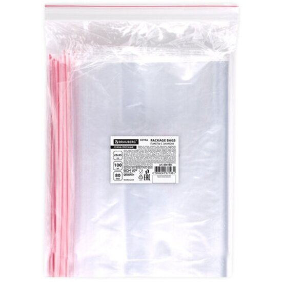 Пакеты с замком Brauberg "зиплок" очень прочные, 100 шт, 20x25 см, ПВД, 80 мкм, Extra