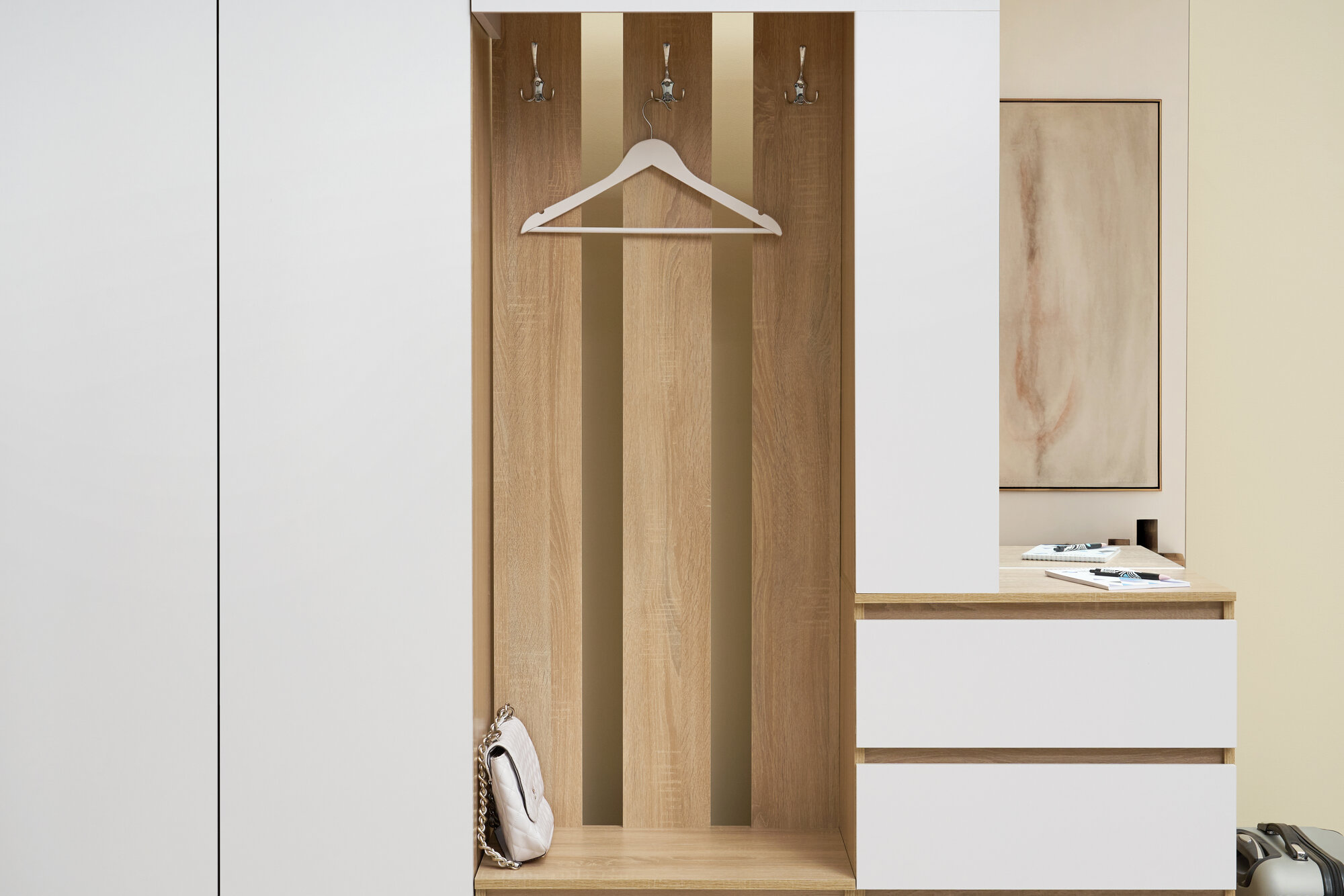 | Дополнительная информация | Прихожая оборудована вешалкой с крючками, обувницей с откидной дверью, зеркалом и 4 выдвижными ящиками. |