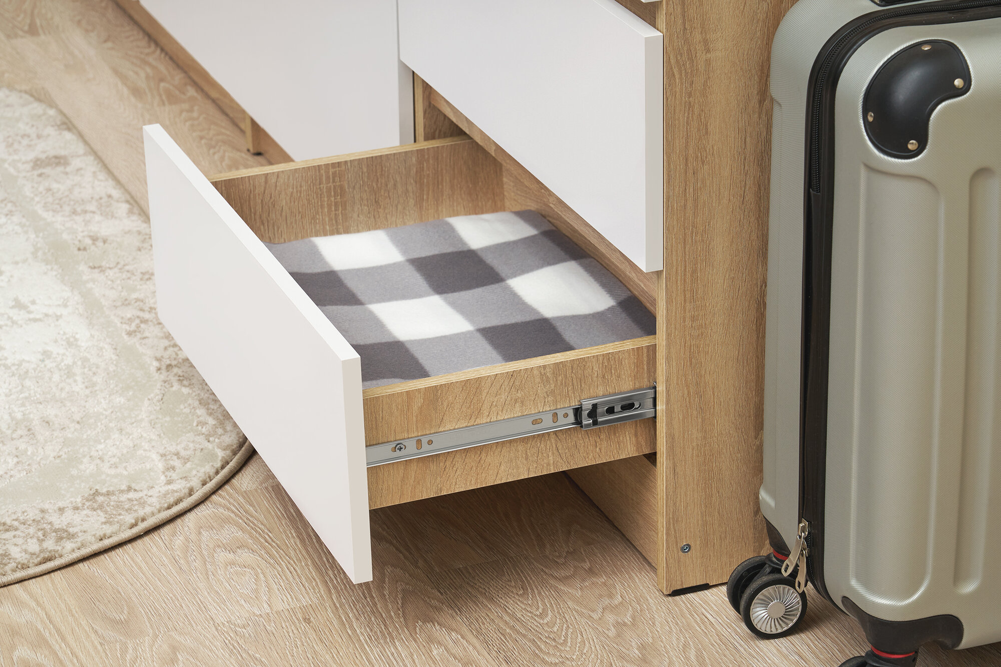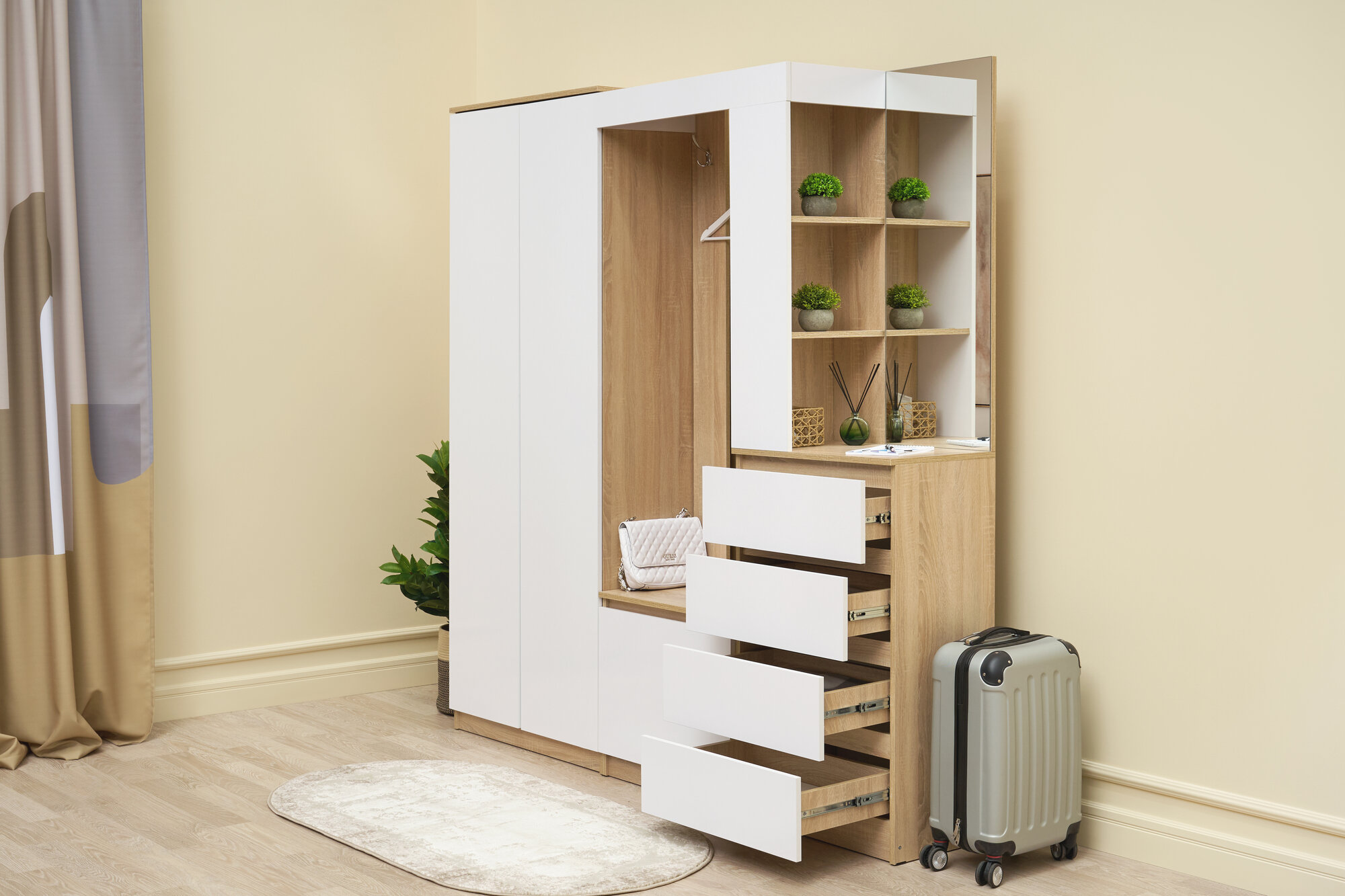 | Состав комплекта | Прихожая оборудована вешалкой с крючками / обувницей с откидной дверью / зеркалом и 4 выдвижными ящиками. Материал корпуса и фасада — ЛДСП. |