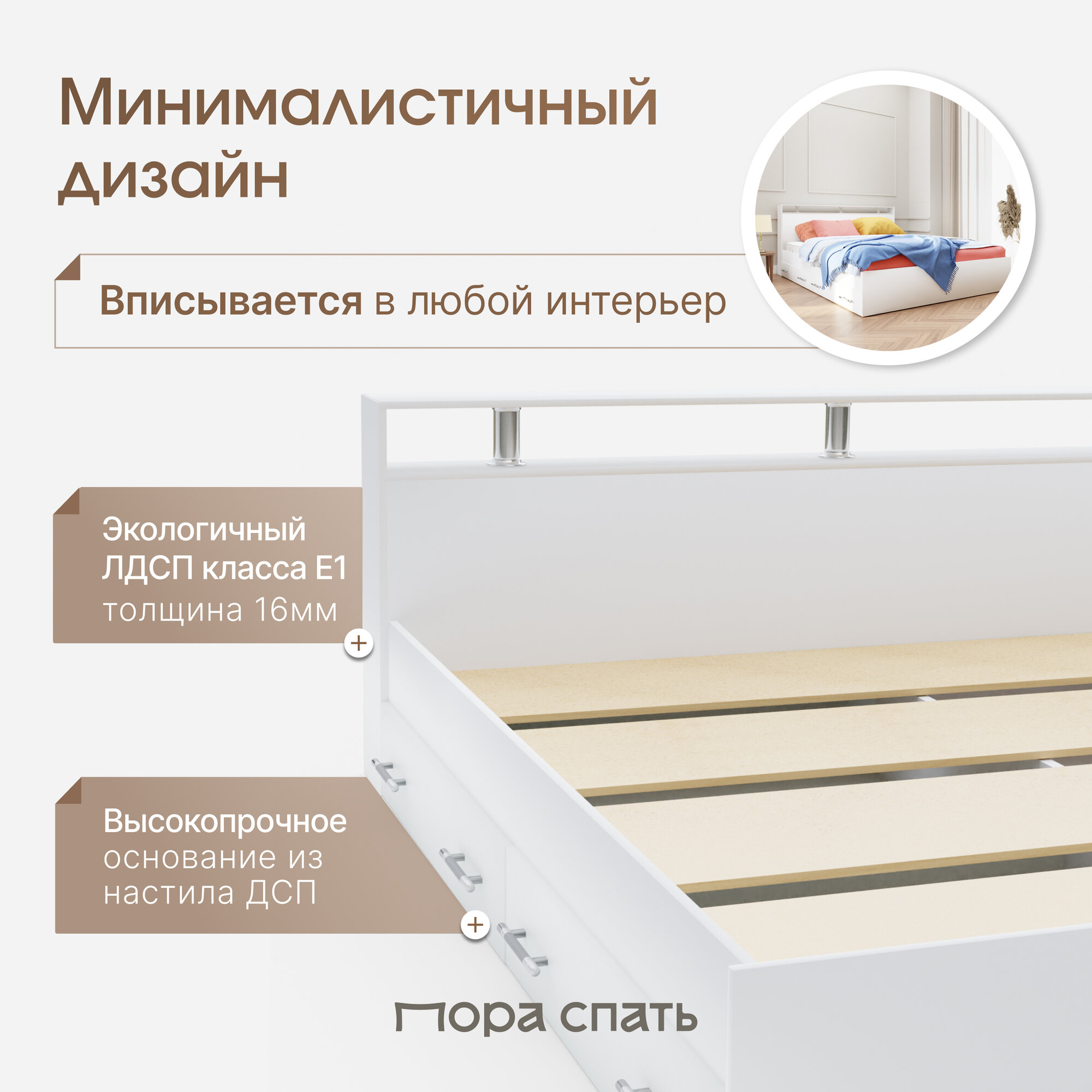 Кровать двуспальная Пора Спать Арина с ящиками и основанием ДСП, белая, спальное место: 200х160 см, габариты: 220х167 см