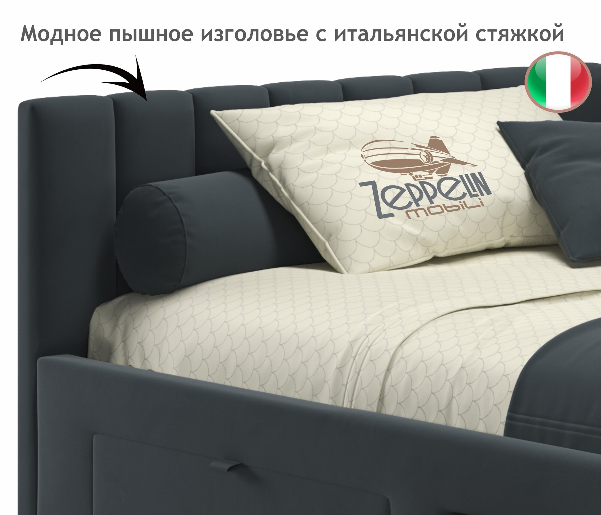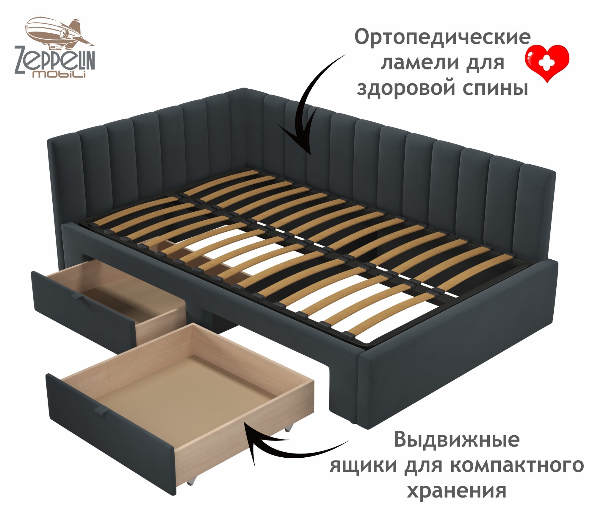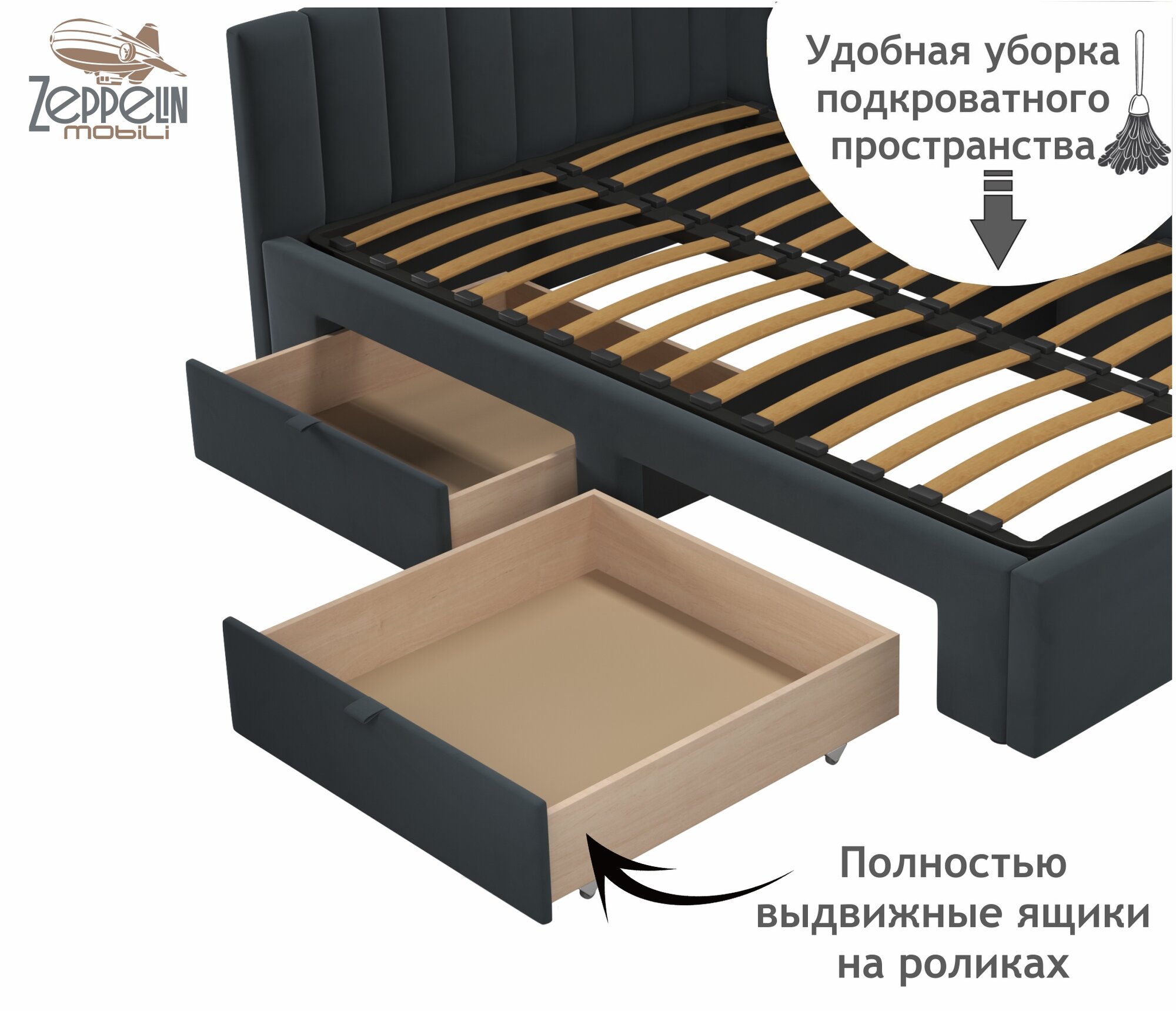 Кровать Milena Zeppelin 120х200 темная с ящиками, из велюра, с ортопедическими ламелями