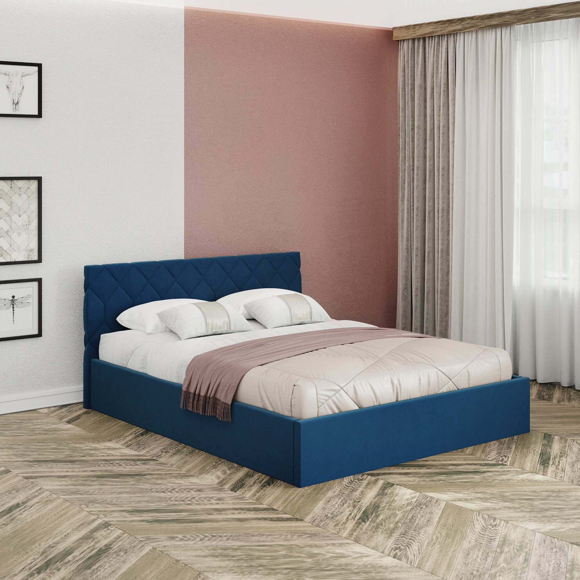 Купить Кровать 160х200 с подъемным механизмом двуспальная Техас с ортопедическим основанием и ящиком для белья, велюр синий