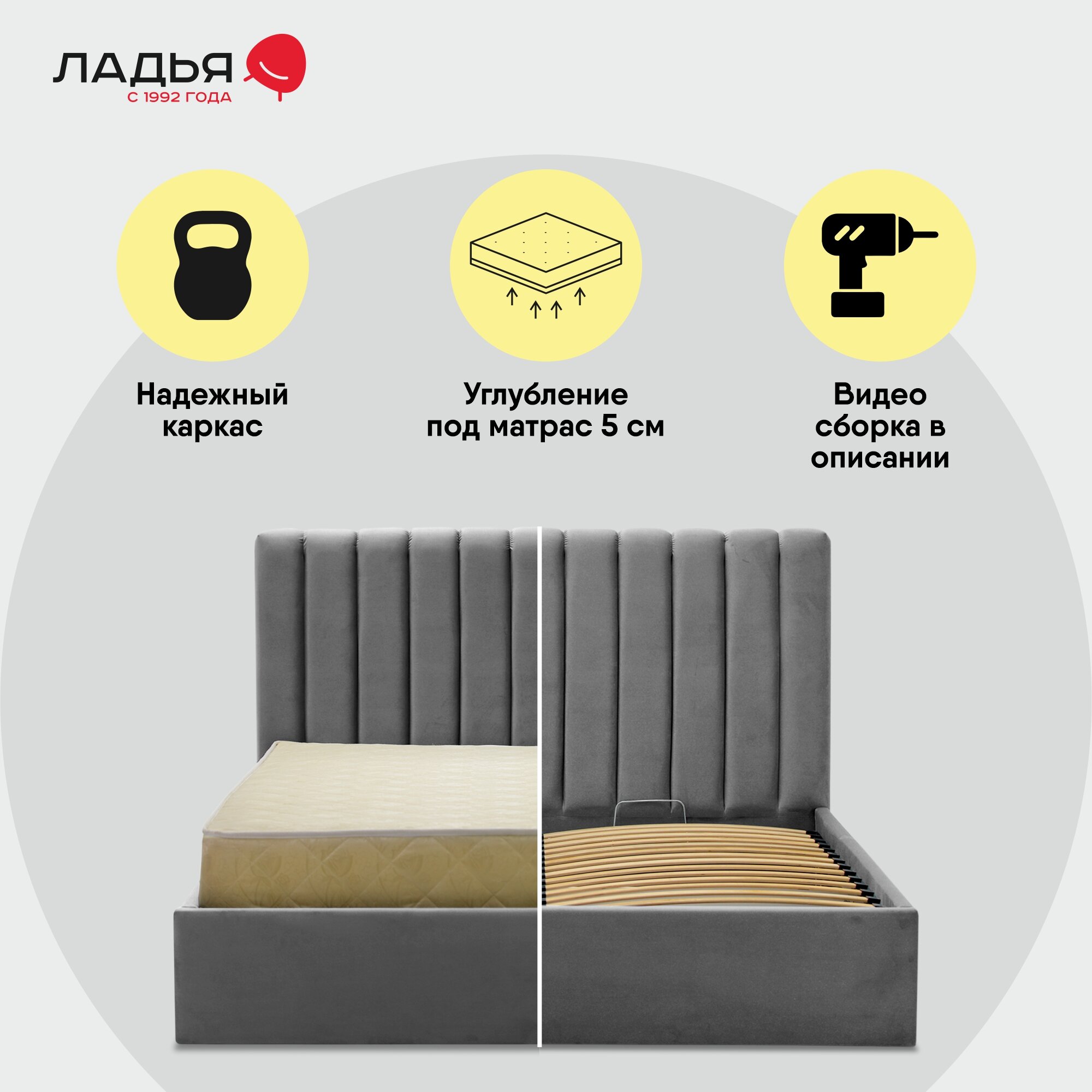 | Особенности | для детей, мягкое изголовье, основание под матрас, с изножьем, с подъемным механизмом, с ящиком для белья |