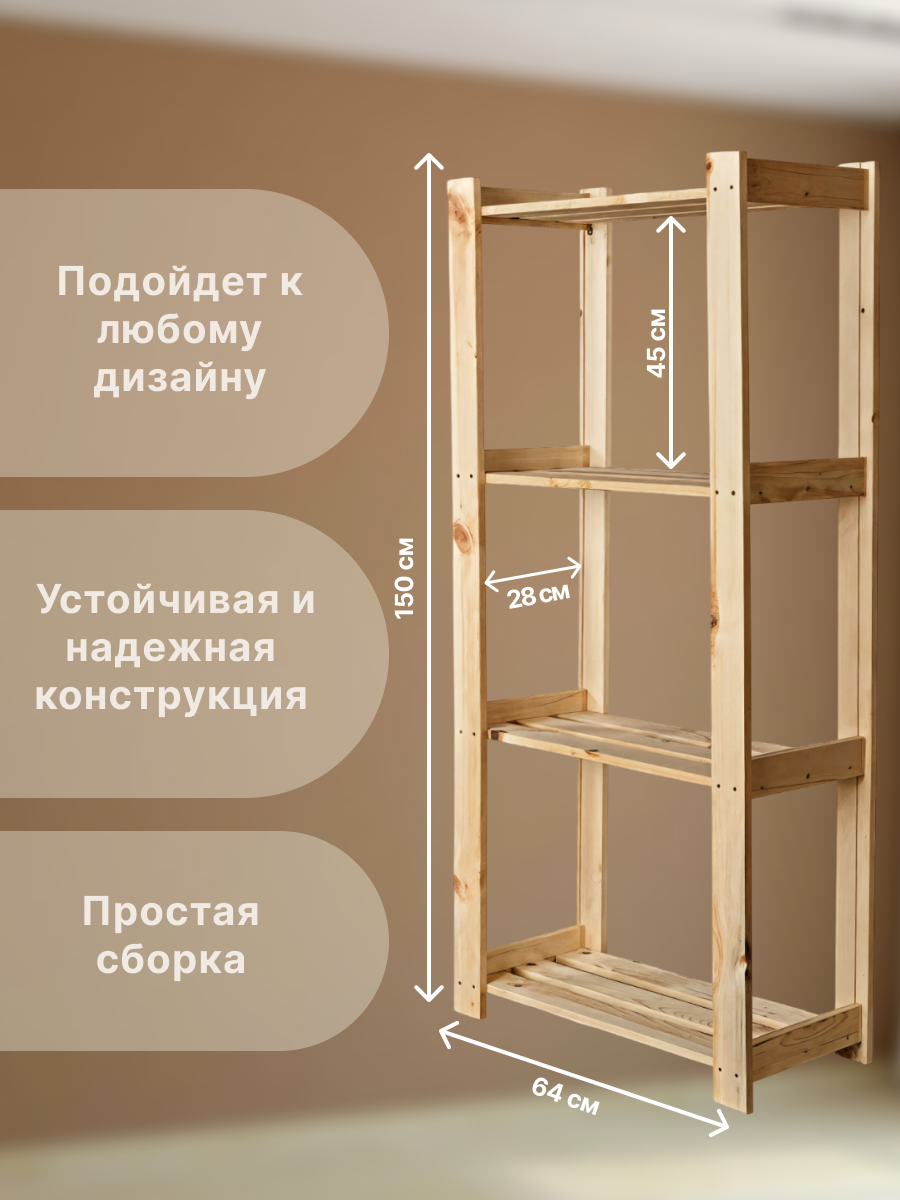 Купить Стеллаж "Елки палки" деревянный, 150х64х28 см, 4 полки, сосна