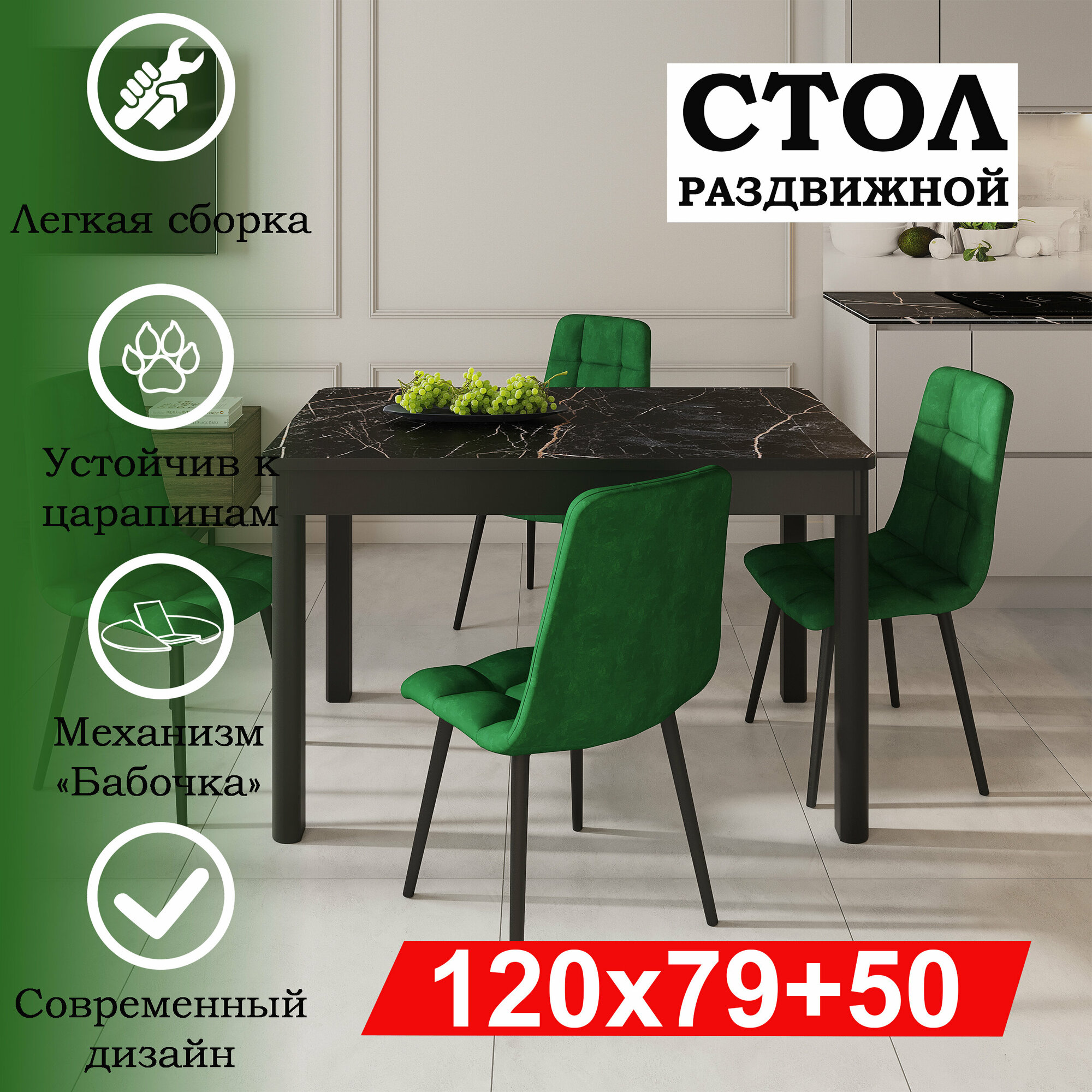 Стол раздвижной гранд-с, 120/170х79, мрамор черный глянцевый, черный