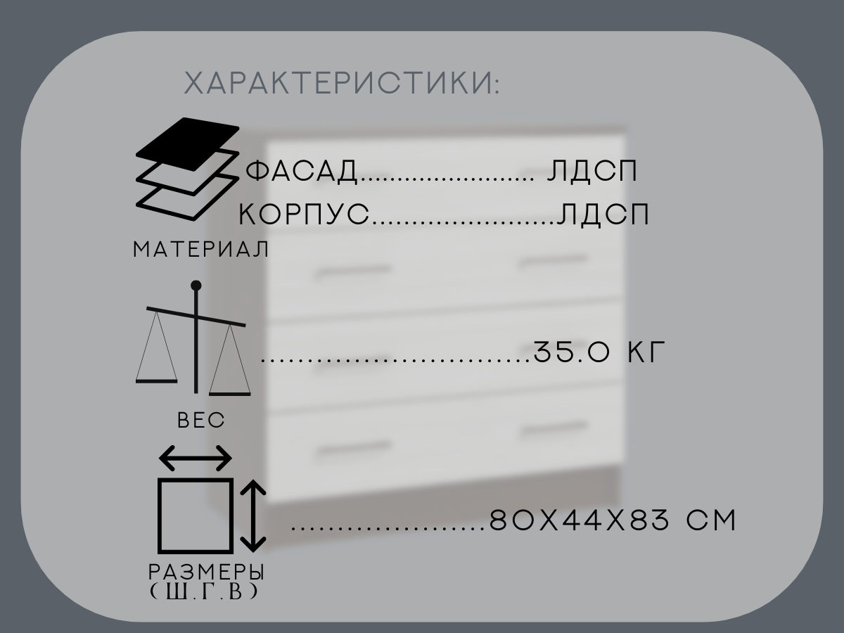 | Дополнительная информация | Комод К- 800 представлен в трёх цветах: Венге/Лоредо, Ясень-шимо и Белый. |
