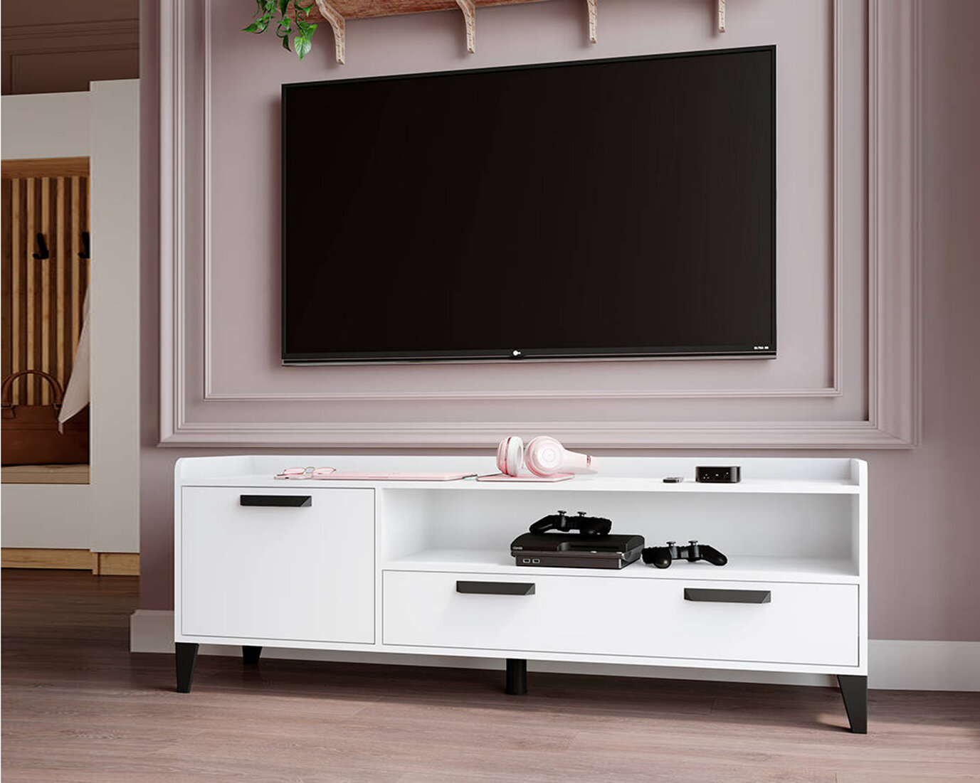 Тумба ТВ Парус-4 Белый с тиснением "Древесные поры" ЛДСП с полками, ящиком для гостиной, спальни, 490х1200х375, тэкс