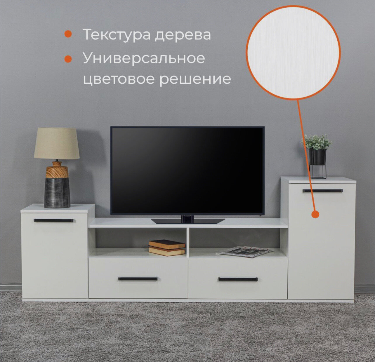 Тумба ТВ Парус-4 Белый с тиснением "Древесные поры" ЛДСП с полками, ящиком для гостиной, спальни, 490х1200х375, тэкс