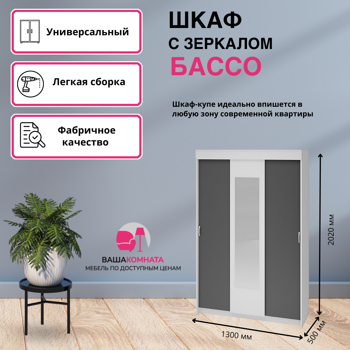 Шкаф-купе Бася/Бассо Серый/Антрацит, ЛДСП, с зеркалом, полками, штангой, для прихожей ,спальни, гостиной, 1300х500х2020, интерьер-центр