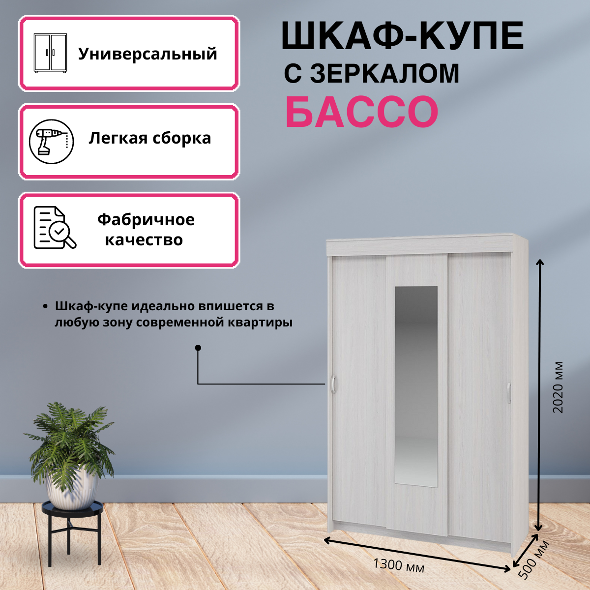 Шкаф-купе Бася/Бассо Ясень Шимо светлый, ЛДСП, с зеркалом, полками, штангой, для прихожей 1300х500х2020 интерьер-центр