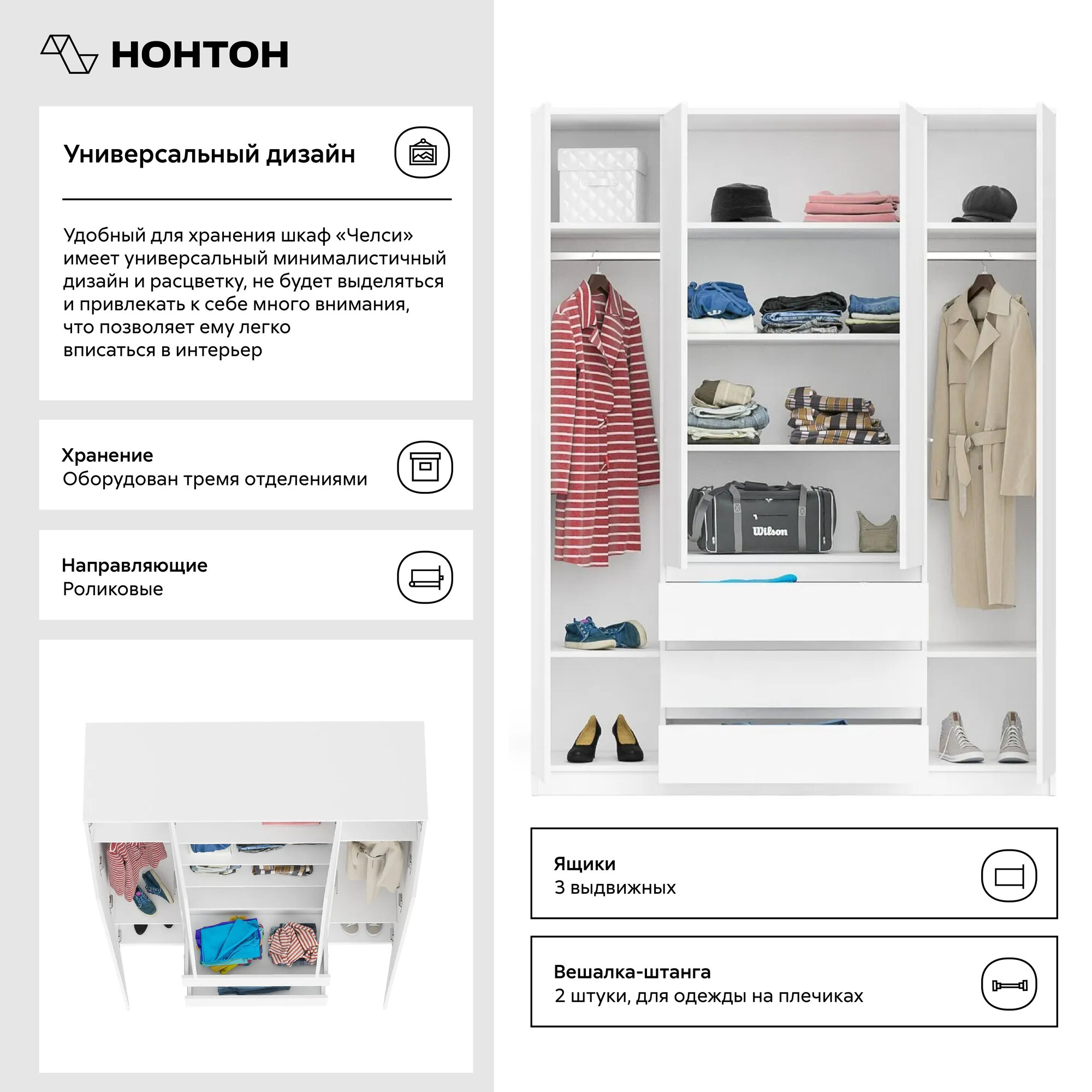 СохранитьШкаф для одежды распашной с ящиками Нонтон Челси, белый / белый глянец, 160 см интересное: