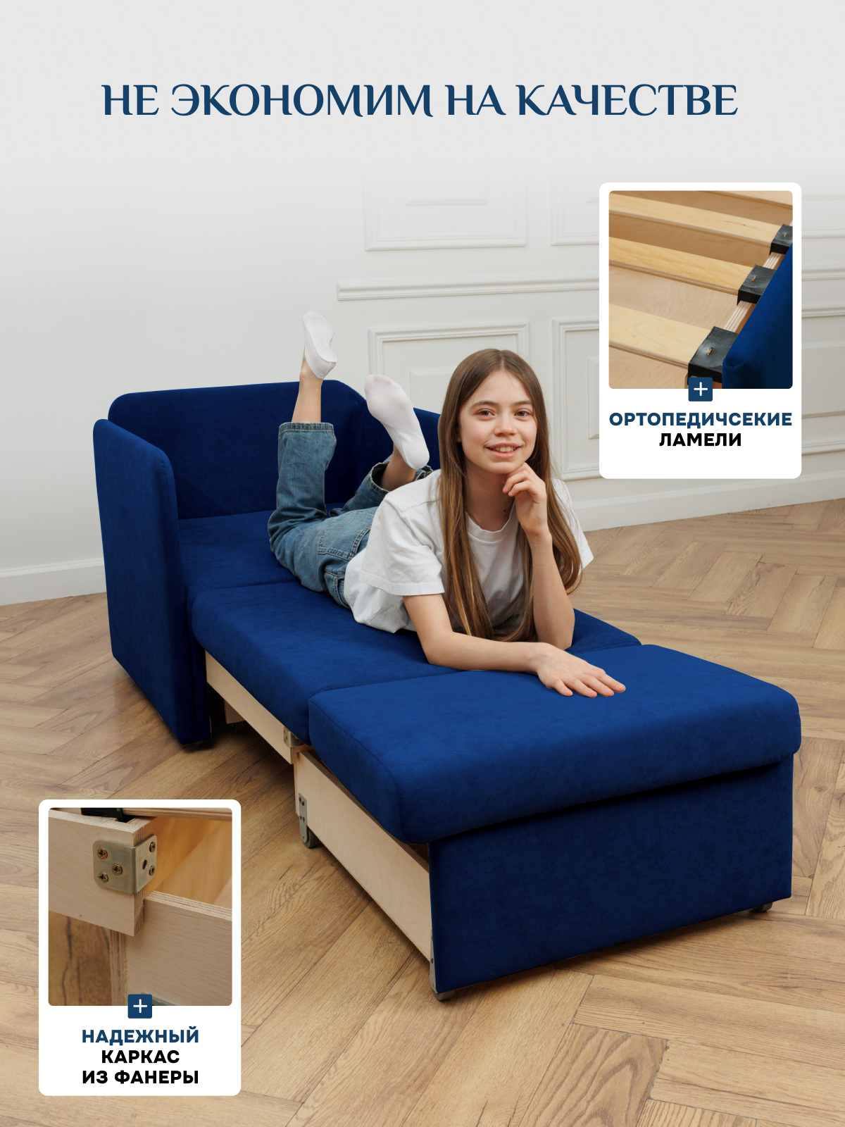 Кресло-кровать на балкон Кресло Brendoss 505 раскладное, кресло-кровать без подлокотников, материал износостойкий велюр, цвет синий
