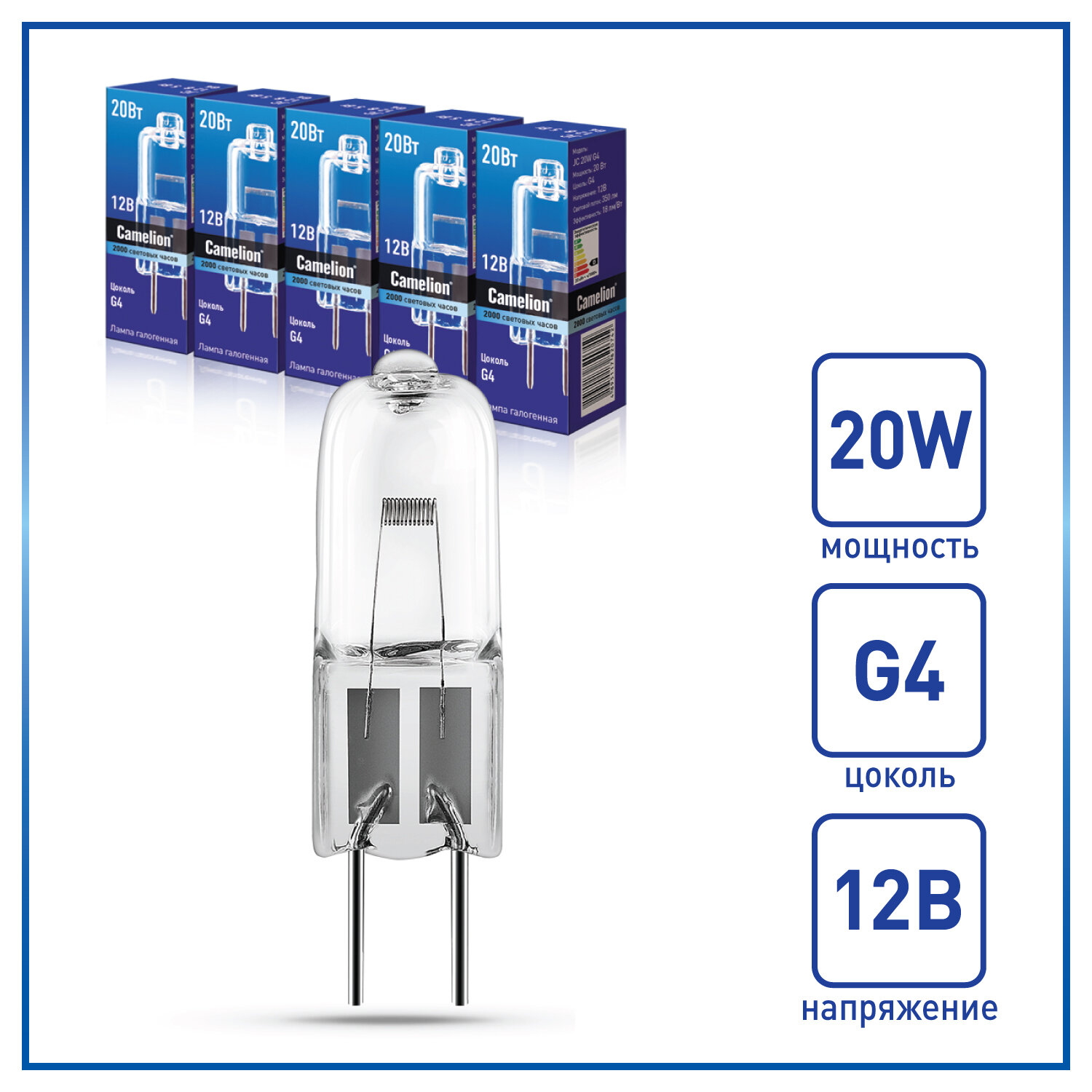 Купить Галогеновые лампочки Camelion JC G4, мощность 20Вт, 12B, низковольтные, 5 штук в упаковке