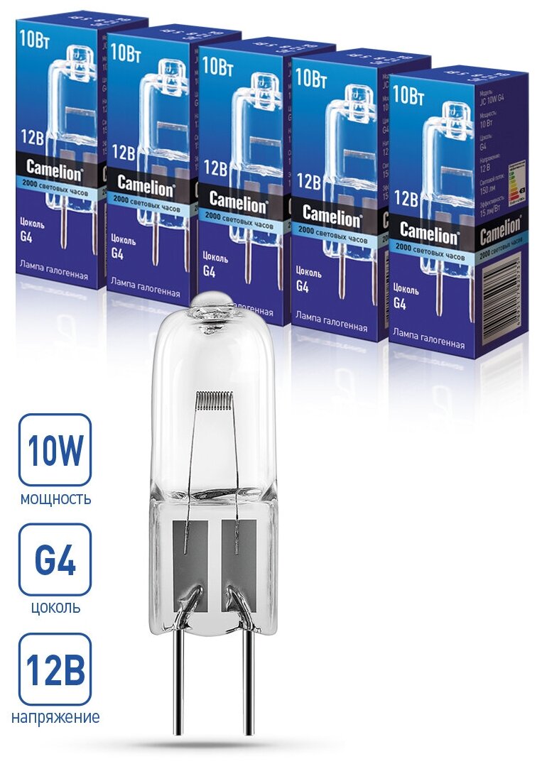 Купить Галогеновые лампочки Camelion JC G4, мощность 10Вт, 12B, низковольтные, 5 штук в упаковке