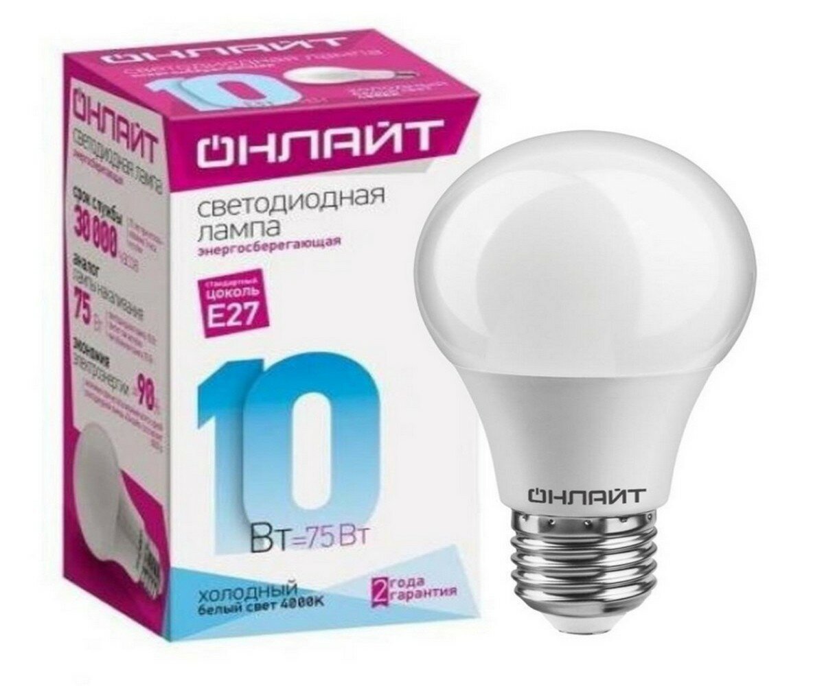 (25 шт.) Светодиодная лампочка онлайт A55, мощность 10 Вт, напряжение питания 220 В, цветовая температура 4000 K, нейтральный белый свет, цоколь E27, размер 55х98 мм